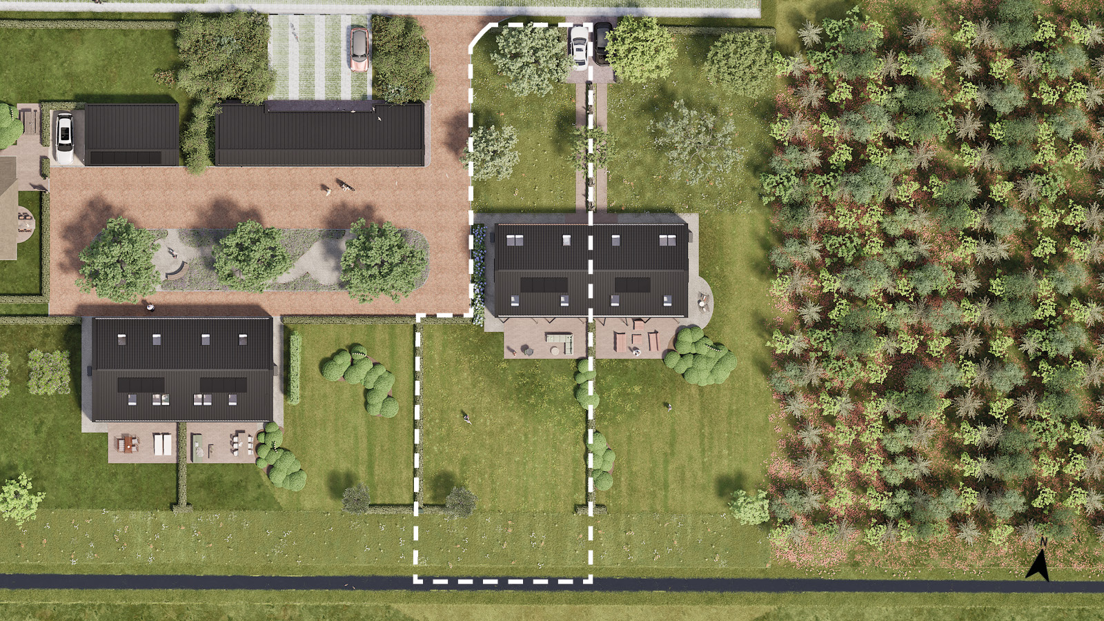 Het project bestaat uit twee karaktervolle erven met in totaal 11 woningen, zorgvuldig ontworpen in een landelijke stijl die aansluit bij het omliggende landschap. Groene zones en wandelpaden verbinden elke woning met het landschap, terwijl duurzaamheid, gezondheid en samenleven vanzelfsprekend zijn verweven in de omgeving. Elk erf vormt een eigen ensemble met een herkenbare opbouw en samenhangende architectuur. Het programma bestaat uit: 3 vrijstaande woningen, 4 twee-onder-een-kapwoningen en 4 rijwoningen. De 4 rijwoningen volgen in fase 2.