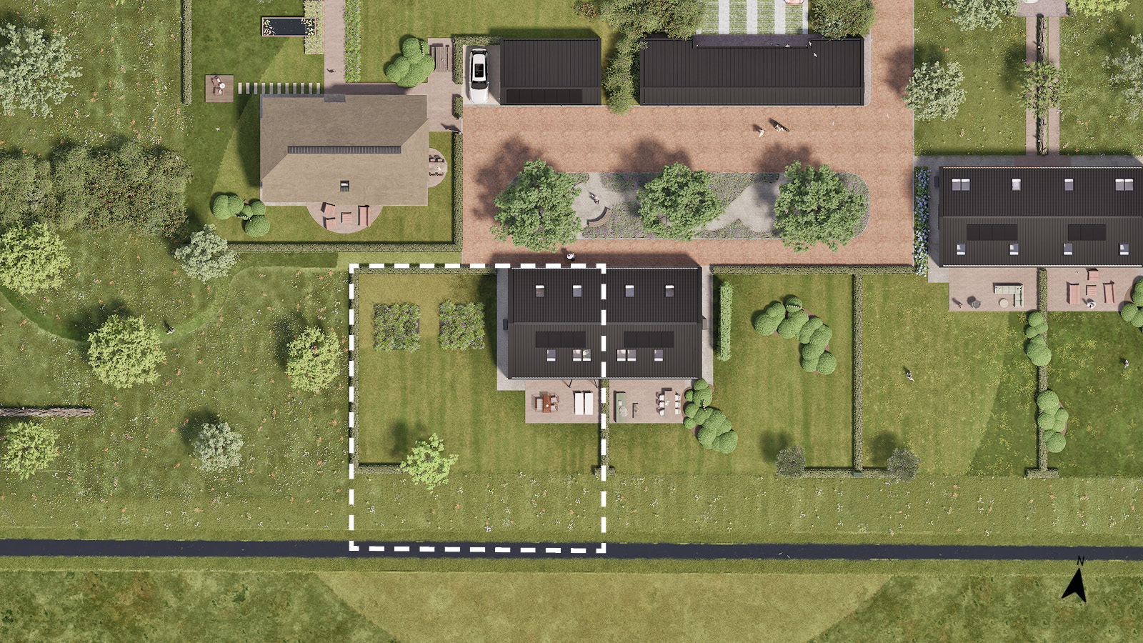 Het project bestaat uit twee karaktervolle erven met in totaal 11 woningen, zorgvuldig ontworpen in een landelijke stijl die aansluit bij het omliggende landschap. Groene zones en wandelpaden verbinden elke woning met het landschap, terwijl duurzaamheid, gezondheid en samenleven vanzelfsprekend zijn verweven in de omgeving. Elk erf vormt een eigen ensemble met een herkenbare opbouw en samenhangende architectuur. Het programma bestaat uit: 3 vrijstaande woningen, 4 twee-onder-een-kapwoningen en 4 rijwoningen. De 4 rijwoningen volgen in fase 2.