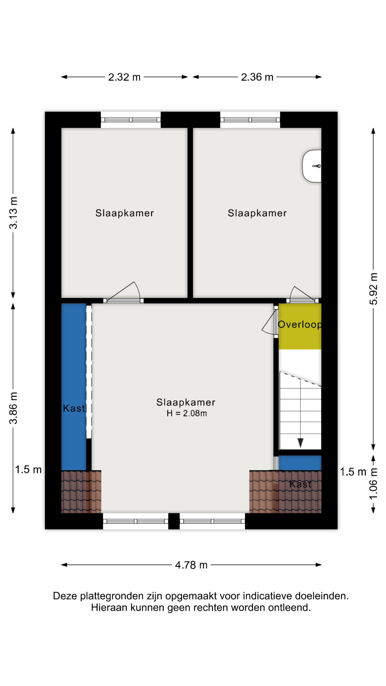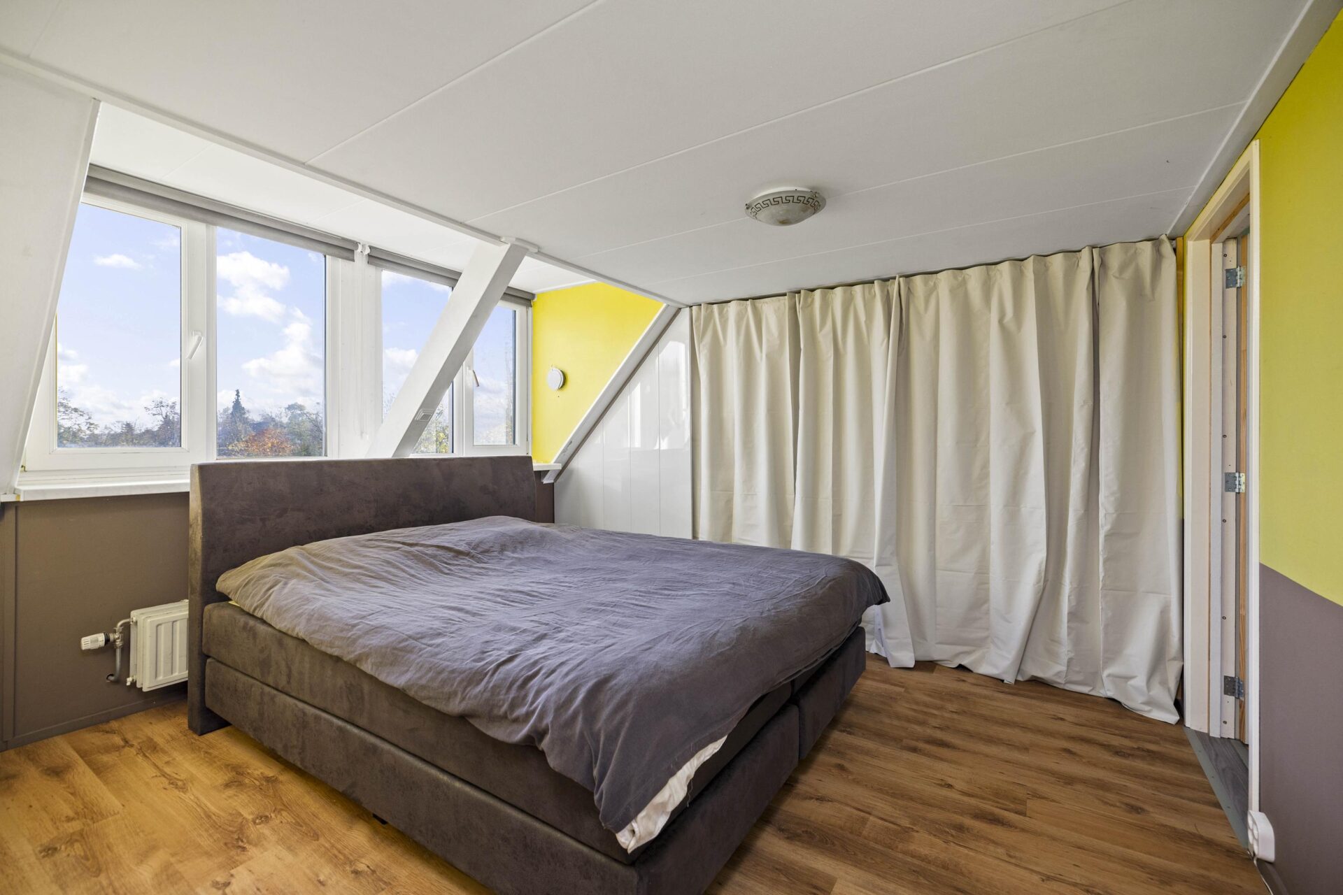 Op de verdieping geeft de overloop toegang tot twee slaapkamers. De grote slaapkamer aan de voorzijde is door het plaatsen van de dakkapel royaal te noemen. Via deze slaapkamer is de derde slaapkamer op de verdieping bereikbaar. Op de overloop is de vliering via een luik bereikbaar.