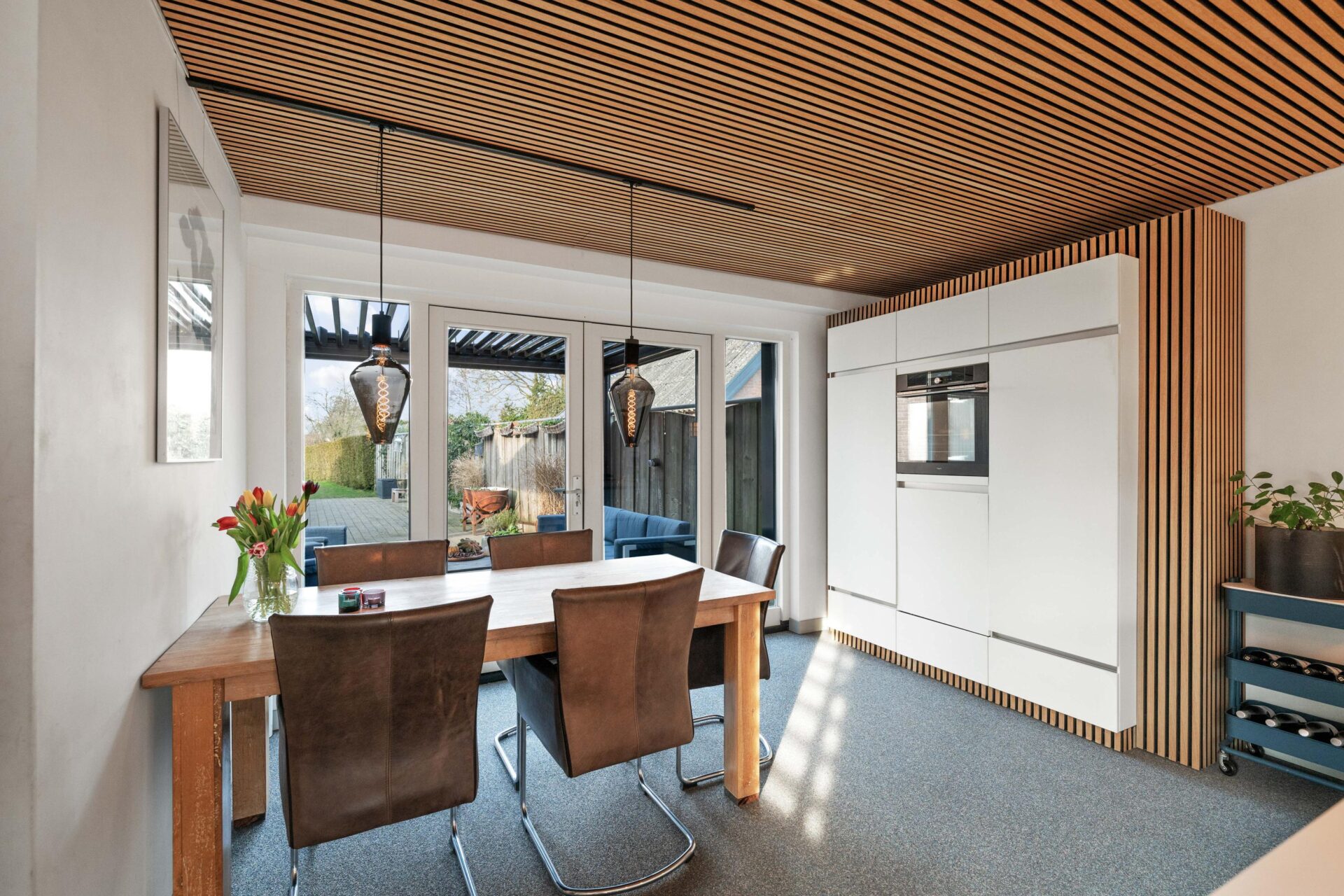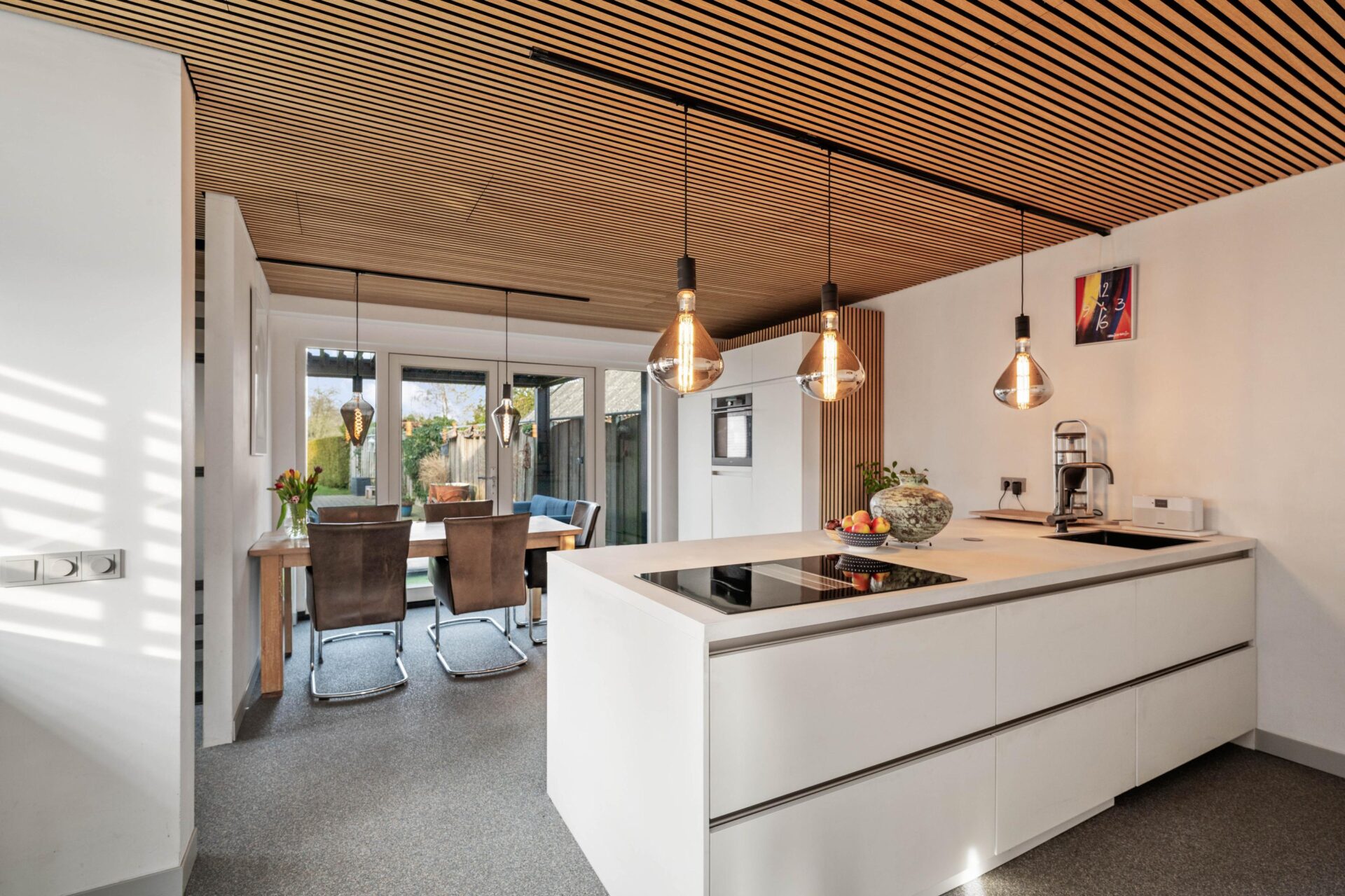 De voordeur brengt je in de hal met garderobe en bergkast. De woonkamer is een prettige ruimte met een sfeervolle houtkachel (ter overname). Er is genoeg ruimte voor het plaatsen van een grote zithoek waar je met de hele familie kunt zitten. De woonkeuken is aan de achterzijde gerealiseerd, een heerlijk royale ruimte! De keuken is ruim opgezet en voorzien van een inductiekookplaat met afzuigfunctie, kokend water kraan, stoomoven, koelkast, vrieskast en vaatwasmachine. De openslaande deuren geven direct toegang tot de veranda. Tevens is er in de keuken ruimte voor het plaatsen van de wasmachine. Via een portaal is het toilet bereikbaar en de achterdeur naar buiten.