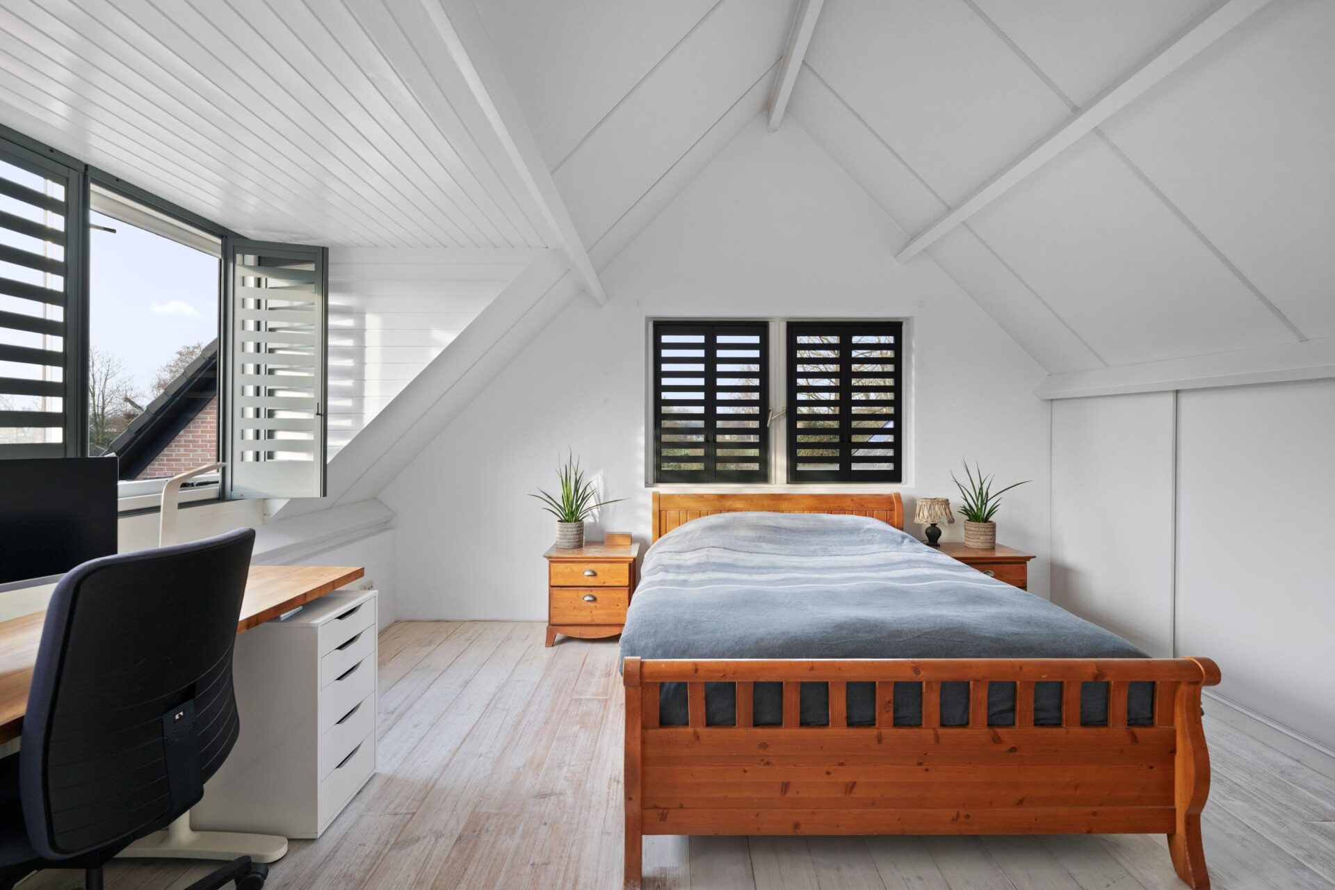 Op de eerste verdieping geeft de overloop je toegang tot drie slaapkamers. Deze zijn alle drie van een goed formaat en voelen mede door de hoogte ruimtelijk aan. De slaapkamer aan de achterzijde van de woning beschikt over een dakkapel en grote vaste kastenwand, ideaal! Tevens kom je vanaf de overloop bij het separate toilet en de badkamer met dubbele wastafel en douchecabine.
