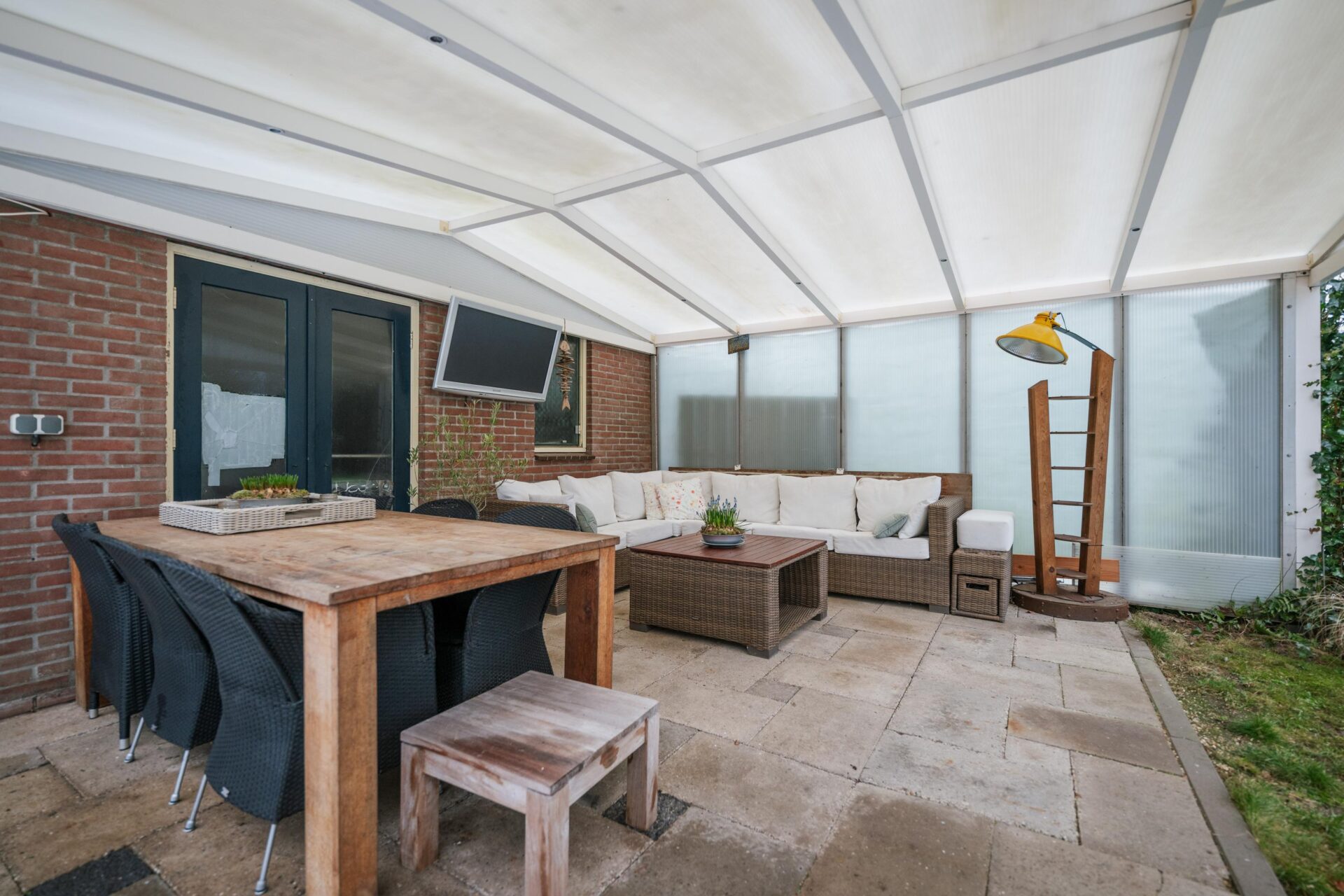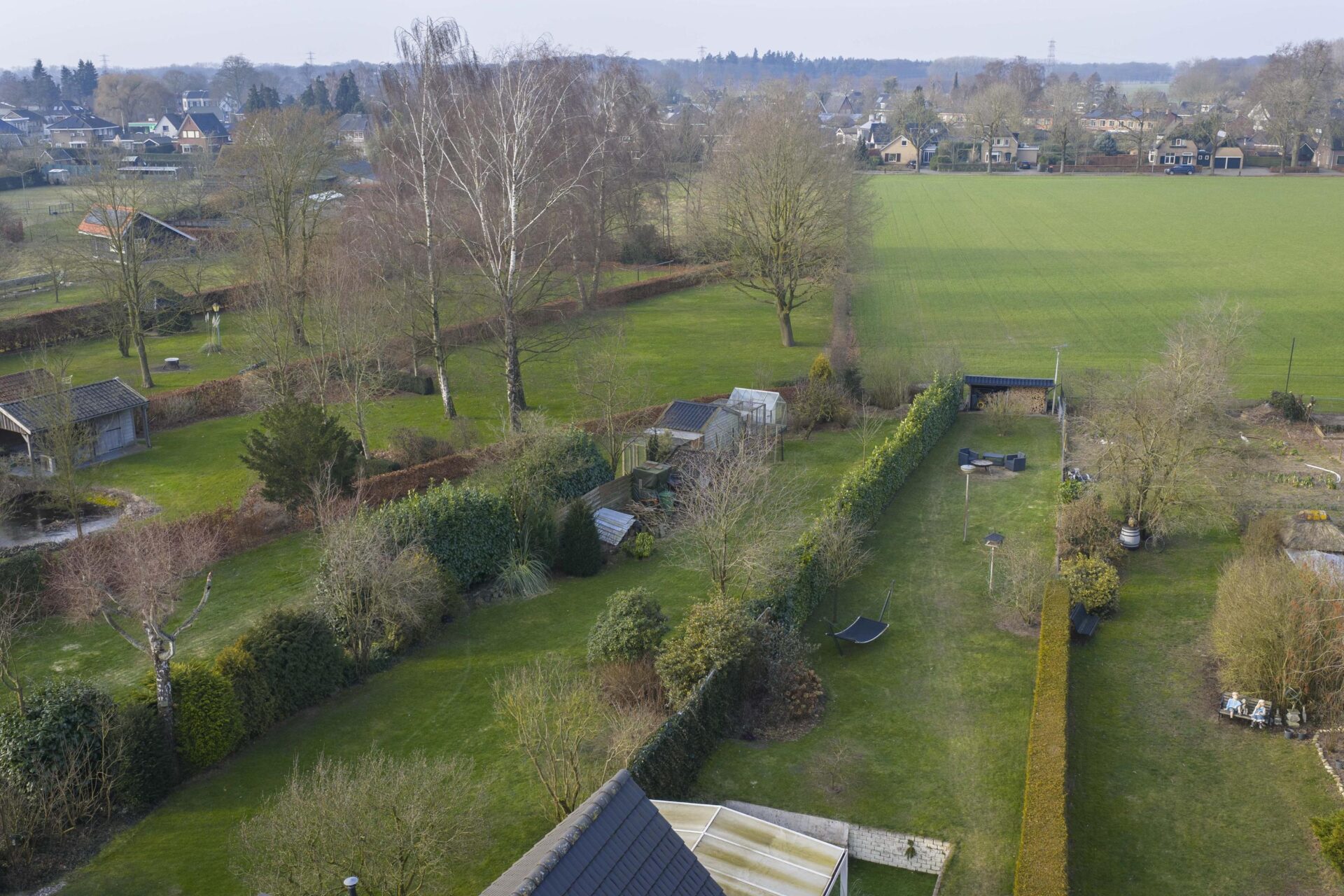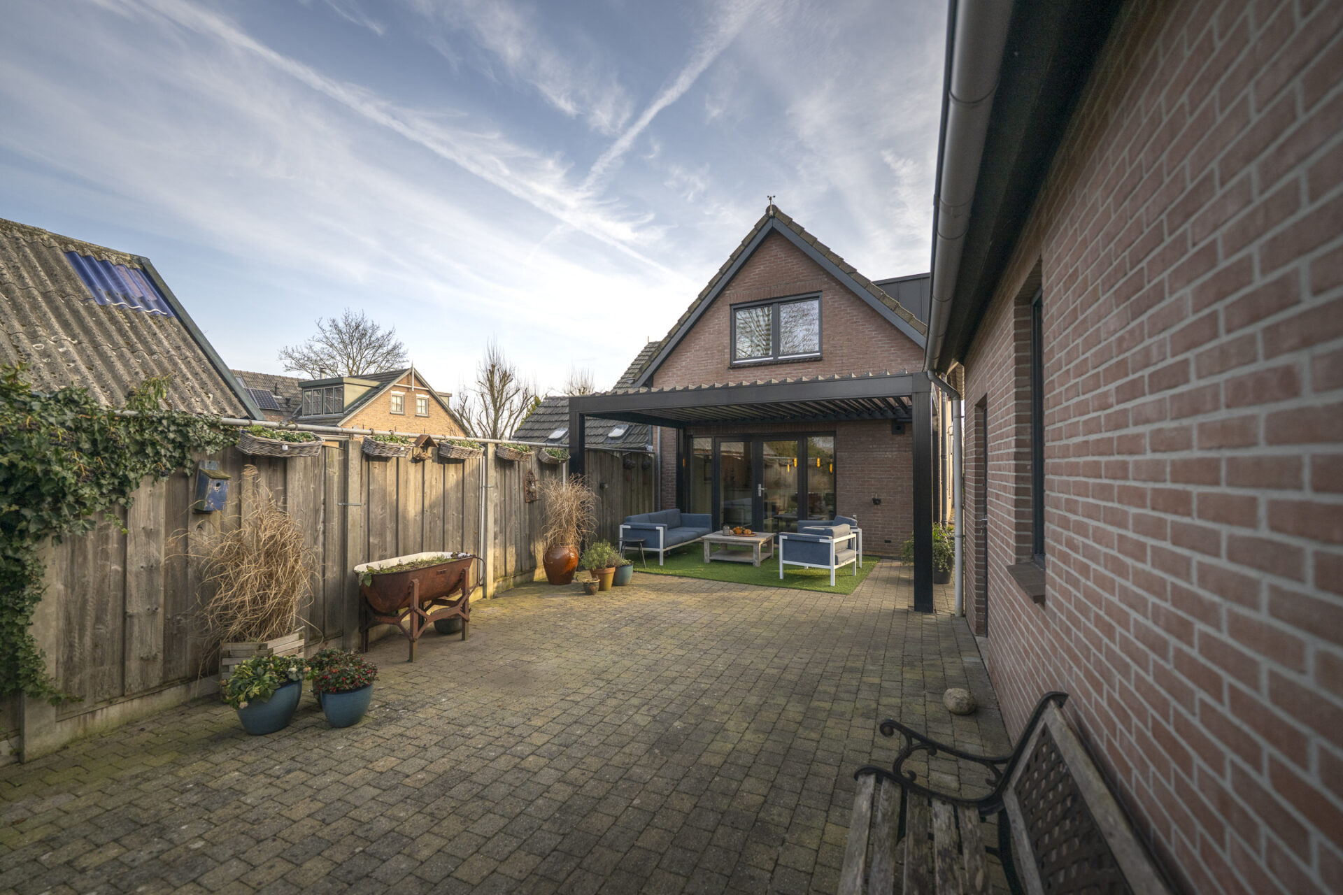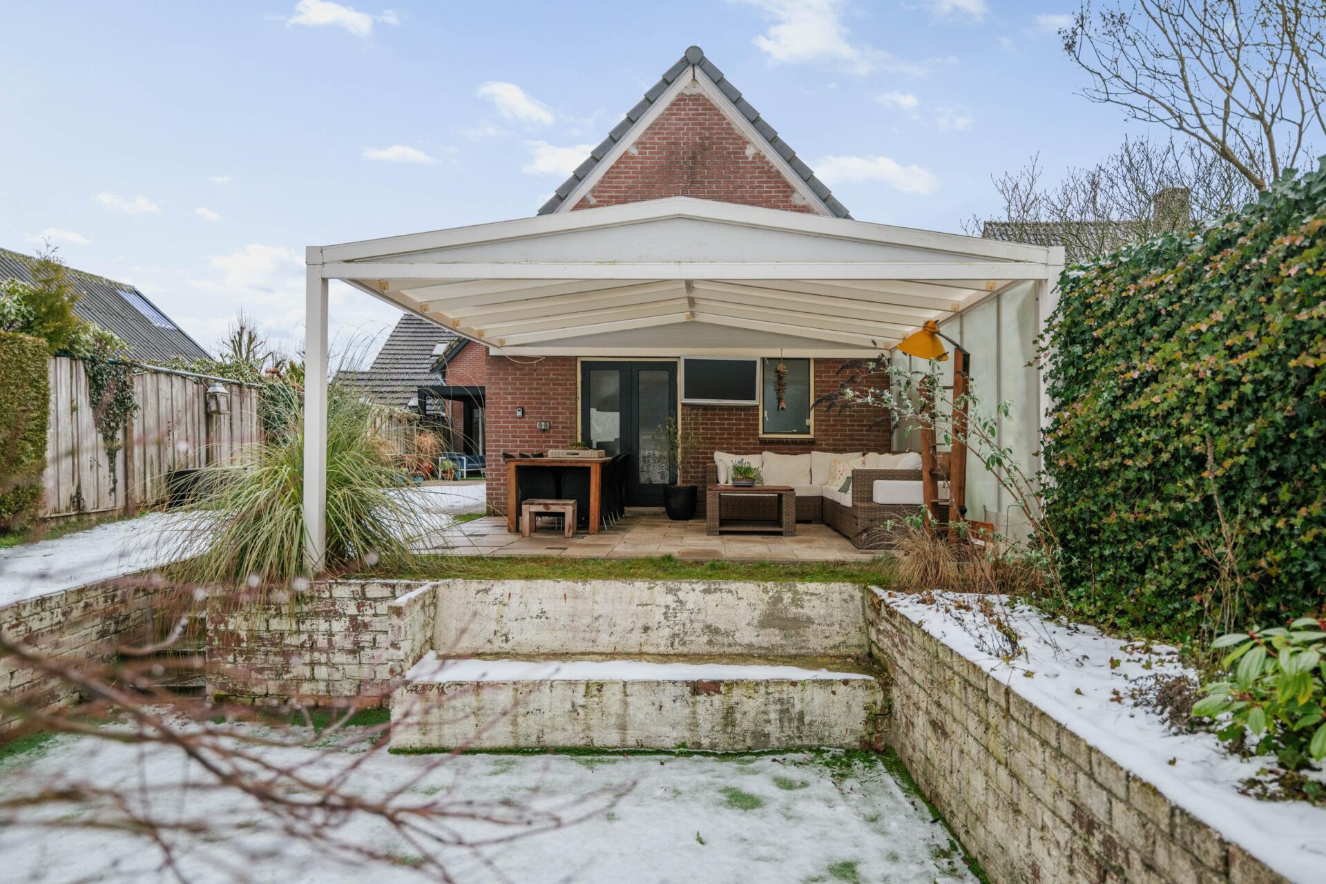 Vanuit de woonkeuken is er directe toegang tot de veranda achter de woning. Deze veranda is voorzien van screens aan 2 kanten en een lamellen dak, waardoor je hier zowel in de zon als in de schaduw heerlijk kunt zitten. De achtertuin is ruim opgezet, biedt veel privacy en gesitueerd op het westen. Een ideale ligging waardoor je op ieder moment van de dag wel een plekje in de zon kunt vinden. Achter de garage is in de tuin nog een tweede veranda gerealiseerd met een vrij uitzicht over het gazon en de zitkuil, een unieke plek om in alle rust van het buitenleven te genieten. In de tuin is een sproei-installatie aangelegd en er is een grondwaterpomp (ter overname) aanwezig. Ook vindt je op diverse plekken elektrapunten.