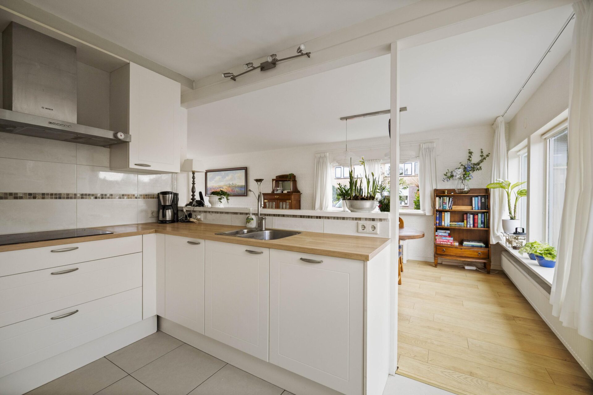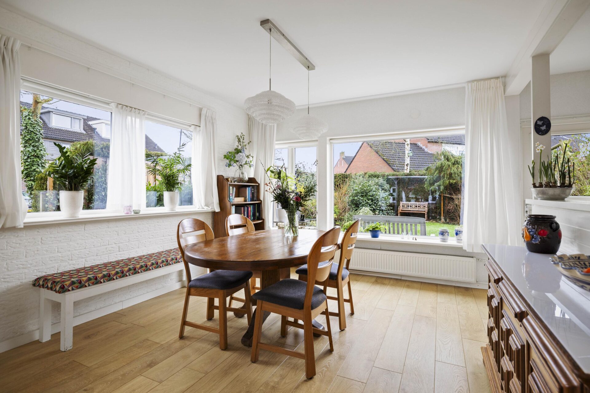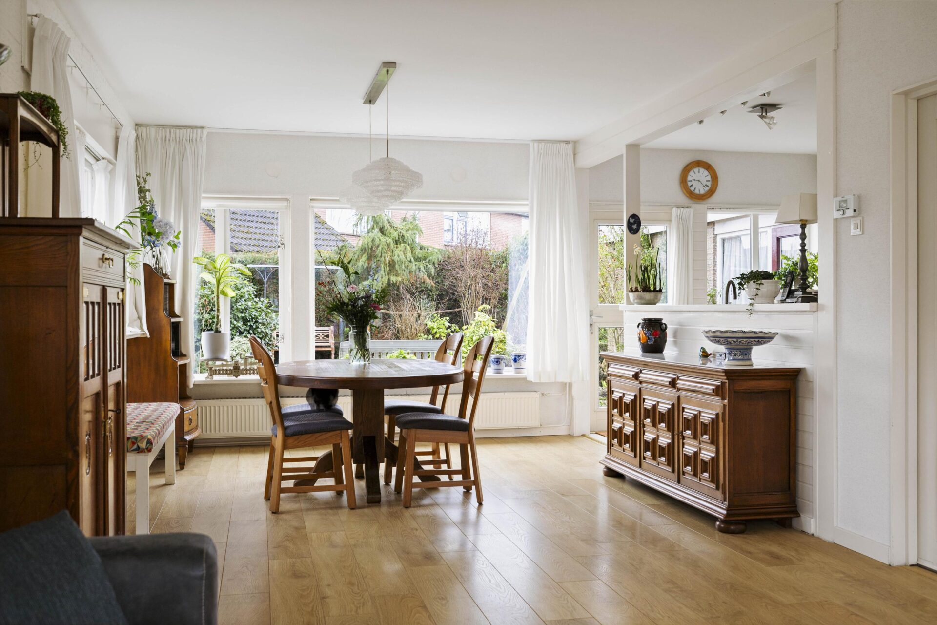 De voordeur brengt je in de hal met meterkast en trapopgang naar de verdieping. De woonkamer is aan de voorzijde van de woning gesitueerd. Er staat een sfeervolle houtkachel. Aan de achterzijde is voldoende ruimte voor een royale eethoek, deze is naast de keuken gesitueerd. De keuken is in een u-opgesteld, uitgevoerd in lichte kleurstellingen en voorzien van de nodige inbouwapparatuur. Vanuit de keuken loop je de hal in met toilet en toegang tot de berging. Dit is gerealiseerd in de voormalige garage.