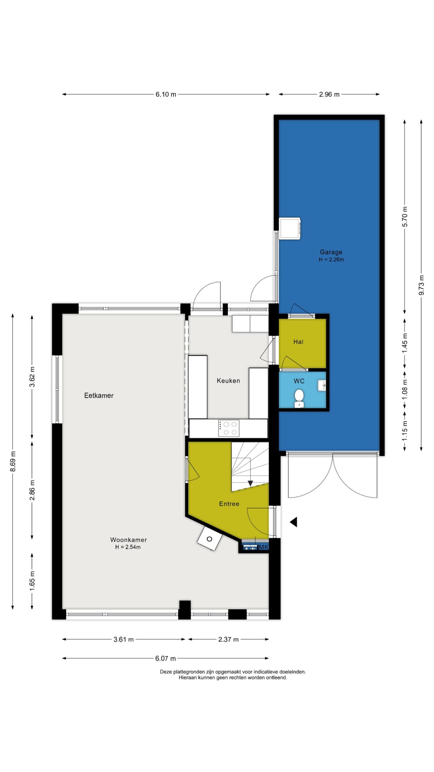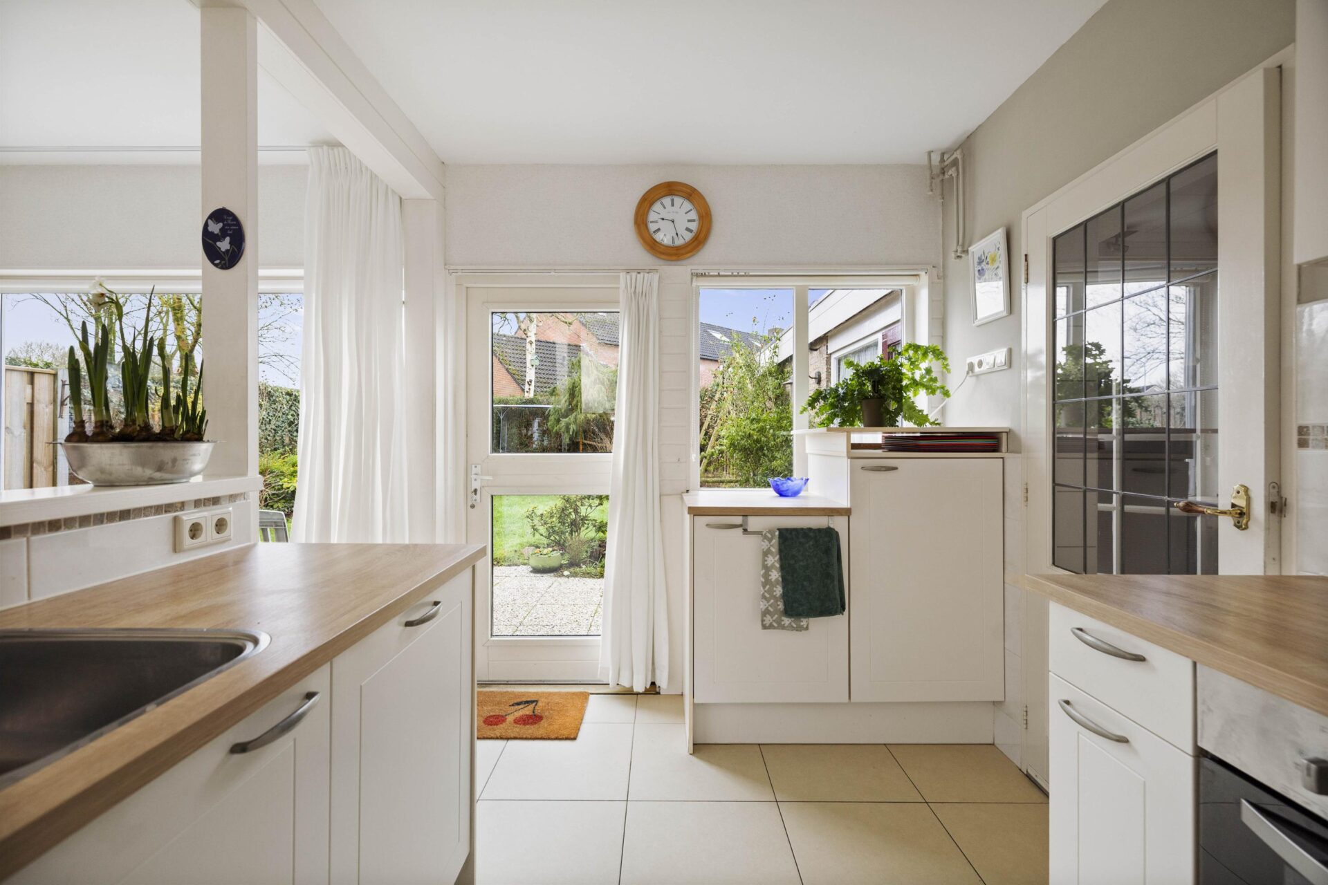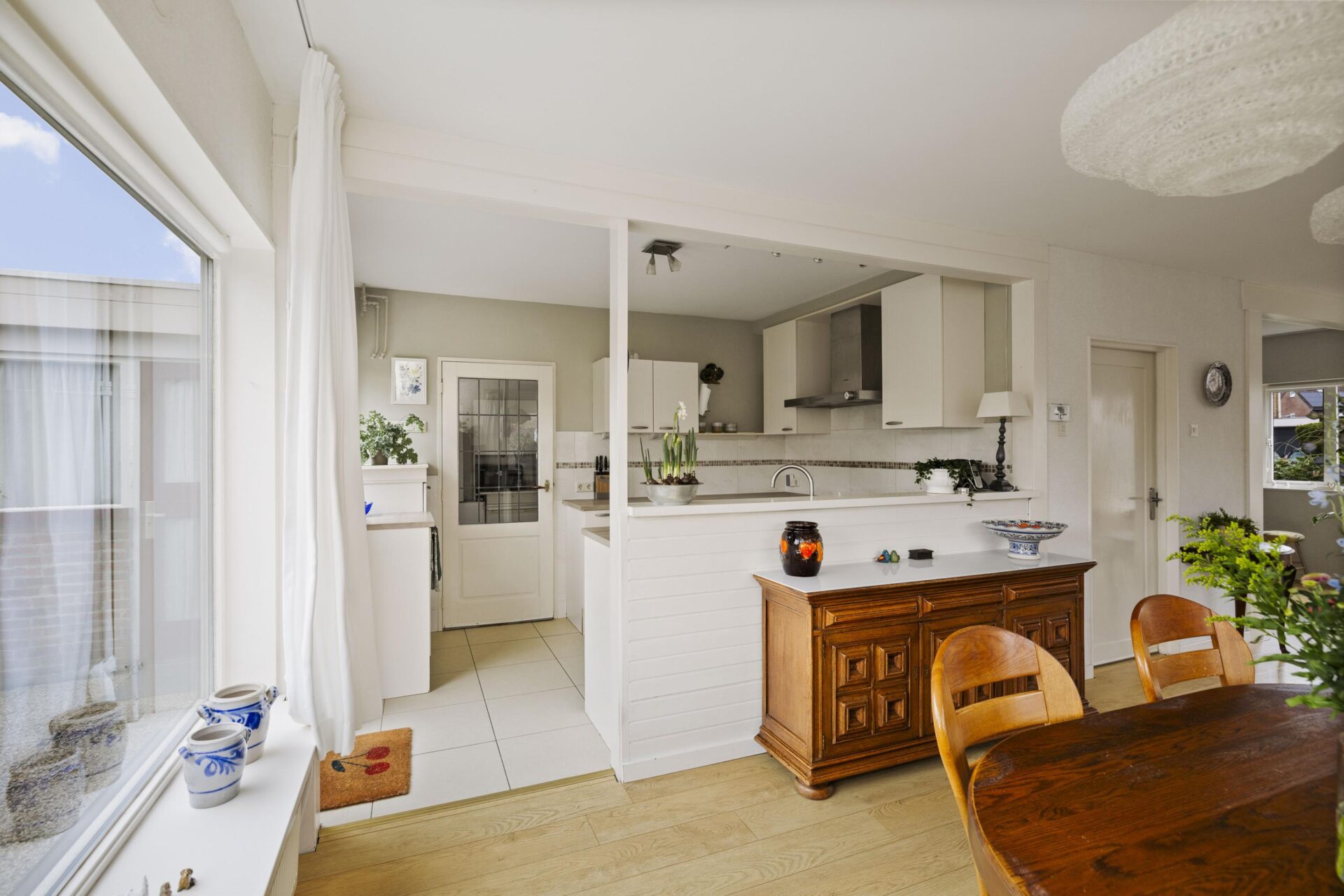 De voordeur brengt je in de hal met meterkast en trapopgang naar de verdieping. De woonkamer is aan de voorzijde van de woning gesitueerd. Er staat een sfeervolle houtkachel. Aan de achterzijde is voldoende ruimte voor een royale eethoek, deze is naast de keuken gesitueerd. De keuken is in een u-opgesteld, uitgevoerd in lichte kleurstellingen en voorzien van de nodige inbouwapparatuur. Vanuit de keuken loop je de hal in met toilet en toegang tot de berging. Dit is gerealiseerd in de voormalige garage.
