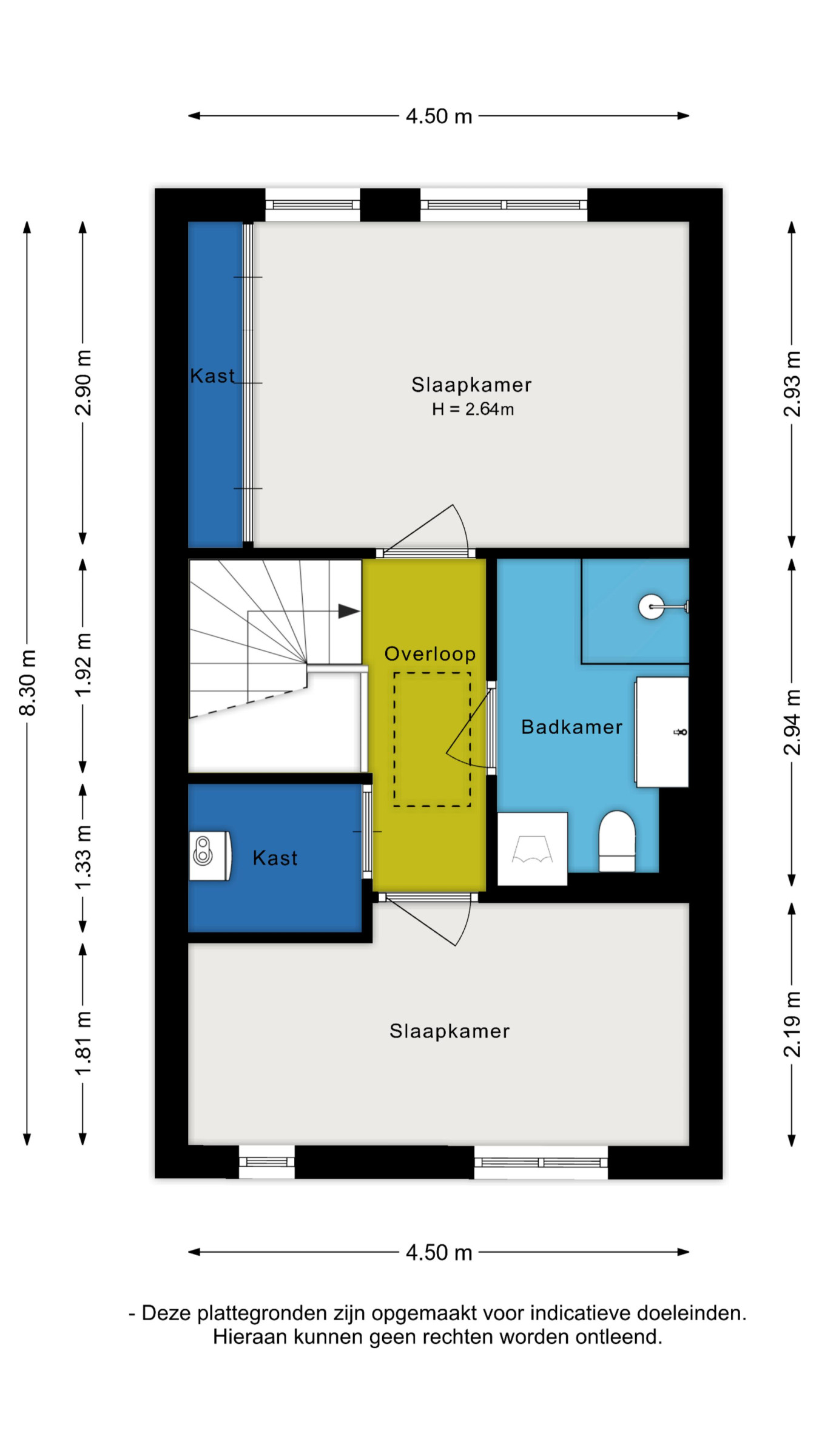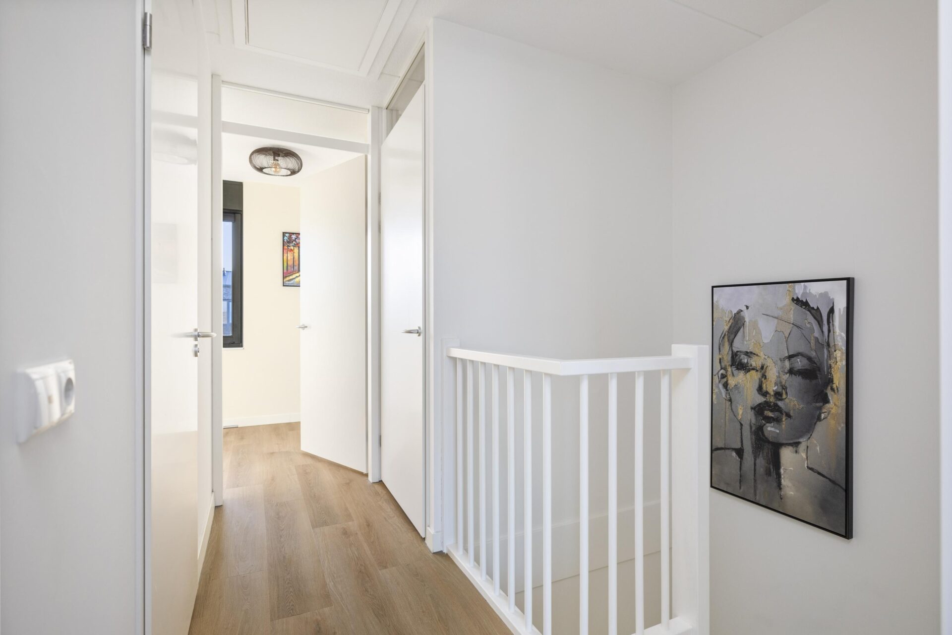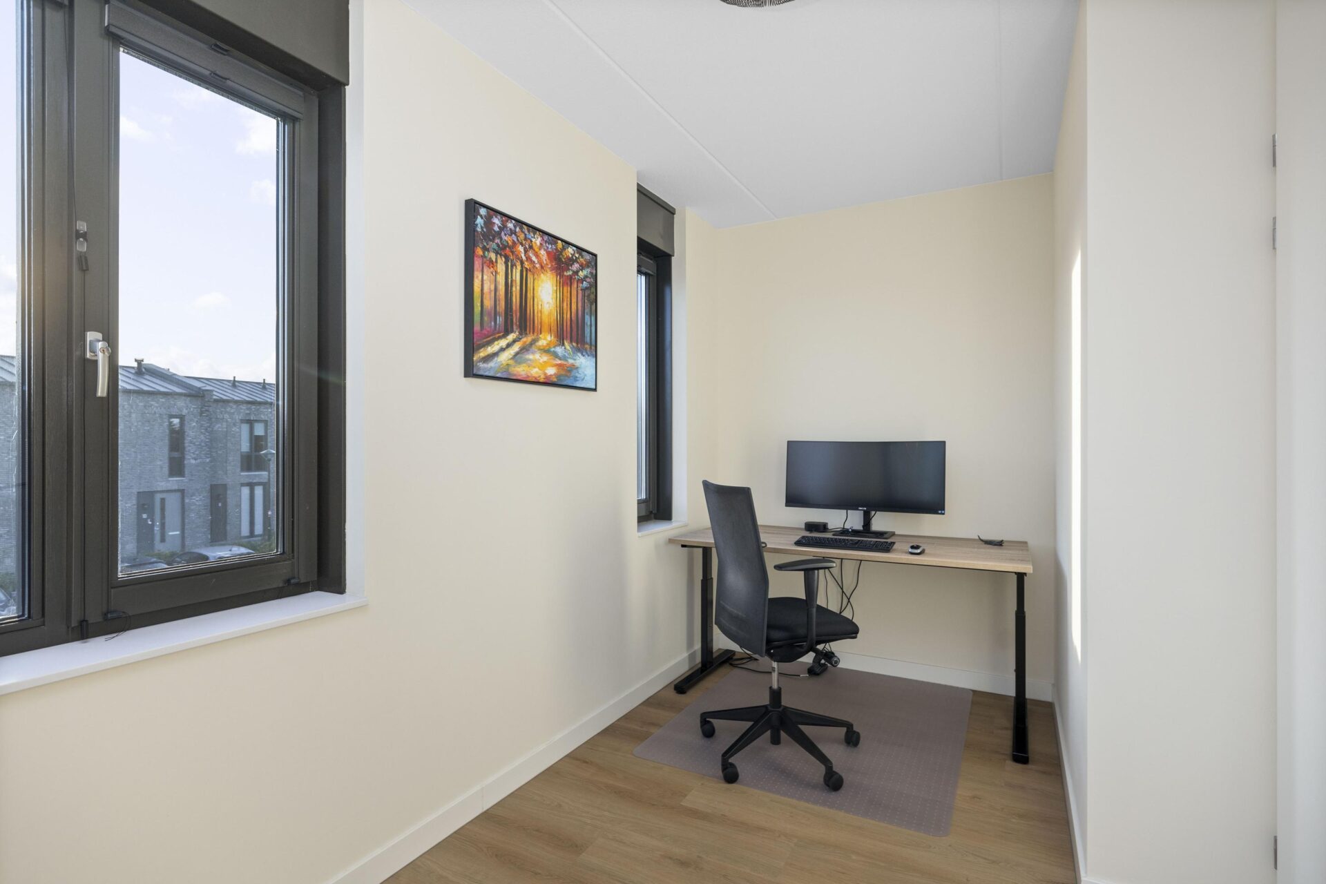 De overloop geeft toegang tot twee slaapkamers, een badkamer en bergruimte. De ruime hoofdslaapkamer is aan de achterzijde gelegen en de tweede slaapkamer is momenteel in gebruik als werkkamer. De moderne badkamer is fraai afgewerkt en beschikt over een inloopdouche, wastafelmeubel, toilet en wasmachine/droger aansluiting. Via een vlizotrap is de vliering bereikbaar, praktisch voor het opbergen van spullen.
