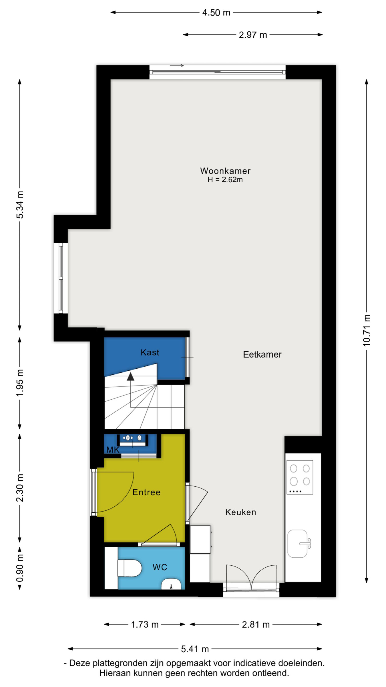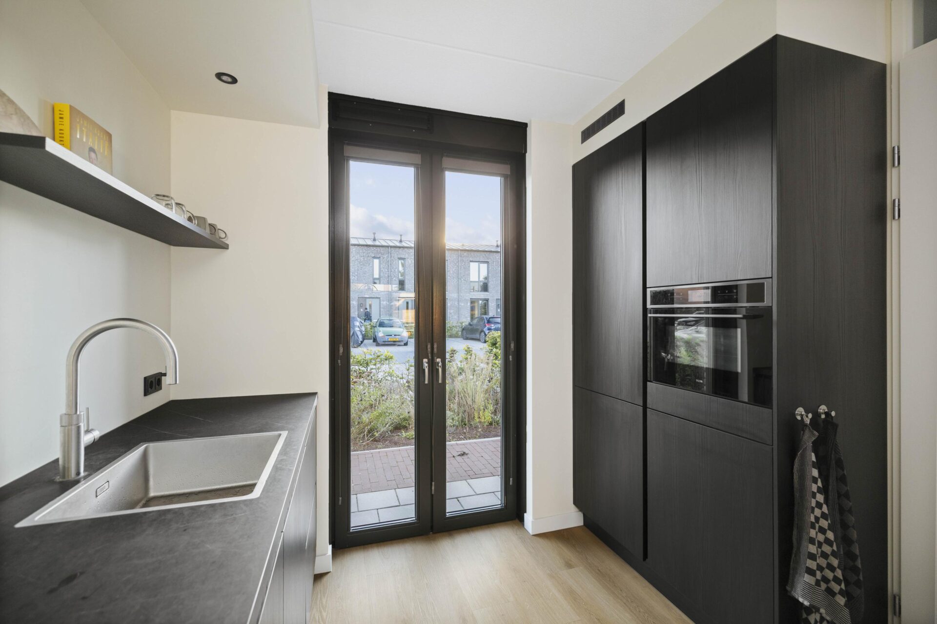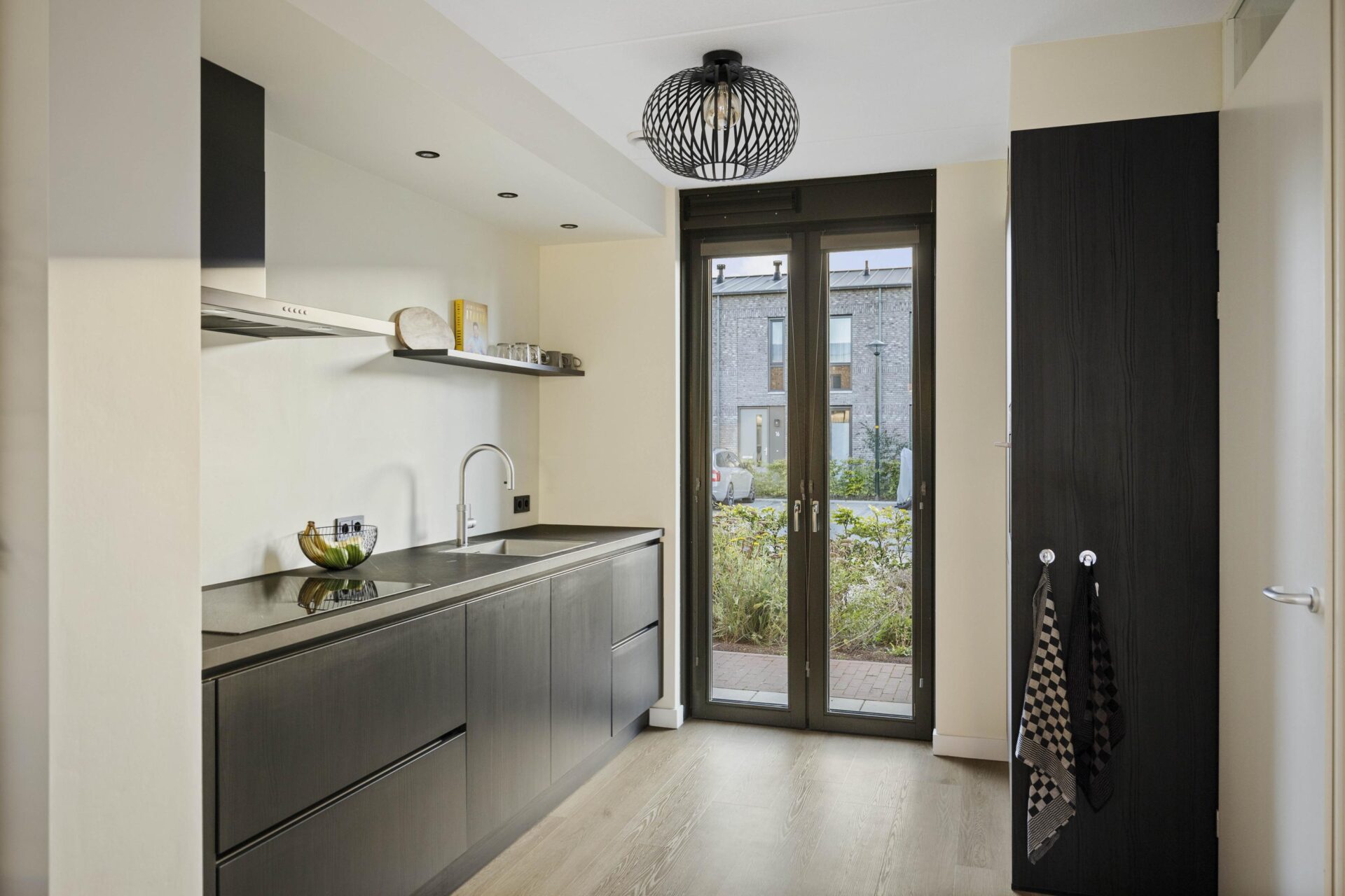 Je komt binnen in de hal met meterkast en toilet. Daarna stap je de leefruimte binnen met aan de voorzijde de moderne keuken. Deze is uitgevoerd in een donkere kleurstelling en beschikt over alle nodige inbouwapparatuur. De woning is over de volle breedte 2,4 m uitgebouwd waardoor er een fijne leefruimte is ontstaan. De sfeervolle woonkamer is gesitueerd aan de achterzijde. Er is voldoende ruimte voor een eethoek en heerlijk ruime zithoek. Via de schuifpui loop je het terras op en de tuin in.
