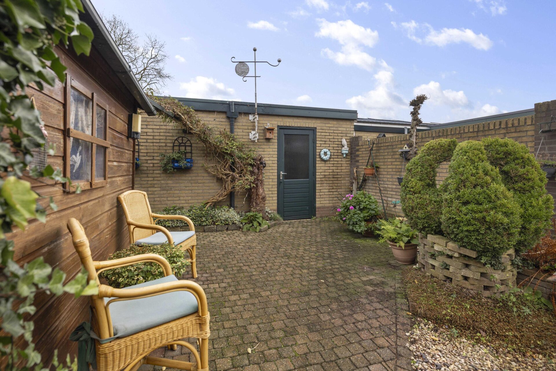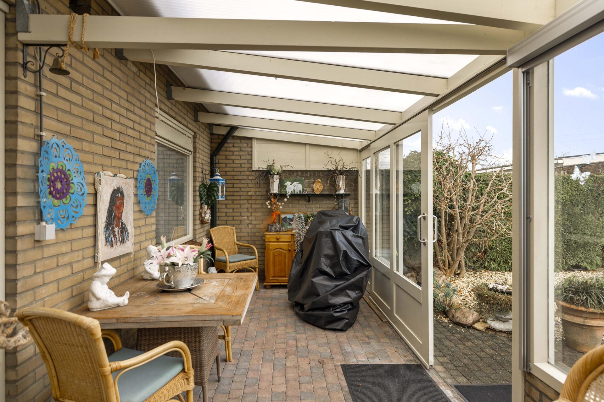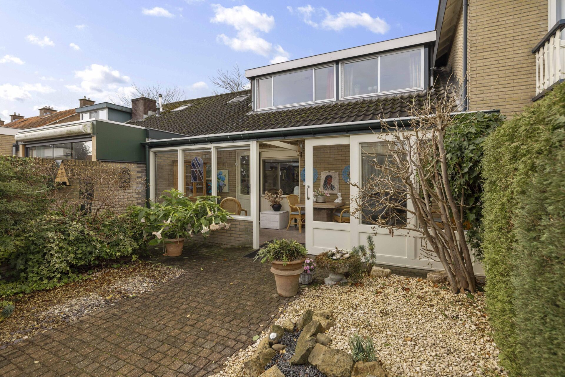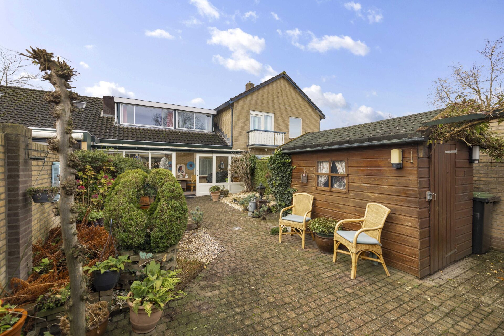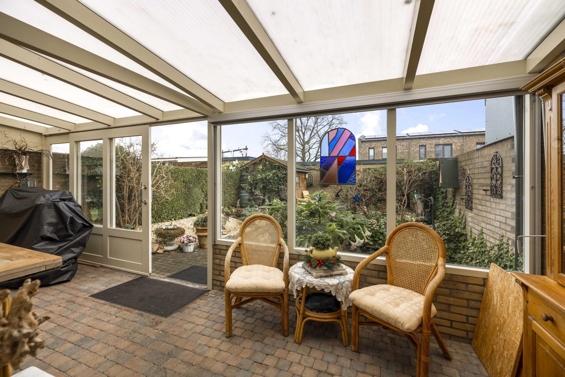 De achtertuin is keurig aangelegd en biedt de nodige privacy. Aan de achterzijde van de woning is een serre aangebouwd, dit wordt gebruik als verlengde van de woning. Je kunt hier een groot gedeelte van het jaar gebruik van maken en genieten van je achtertuin. Het perceel is in totaal 235 m² groot, aan de achterzijde staat een vrijstaande stenen garage met ruime oprit waar zeker twee auto's achter elkaar geparkeerd kunnen worden.