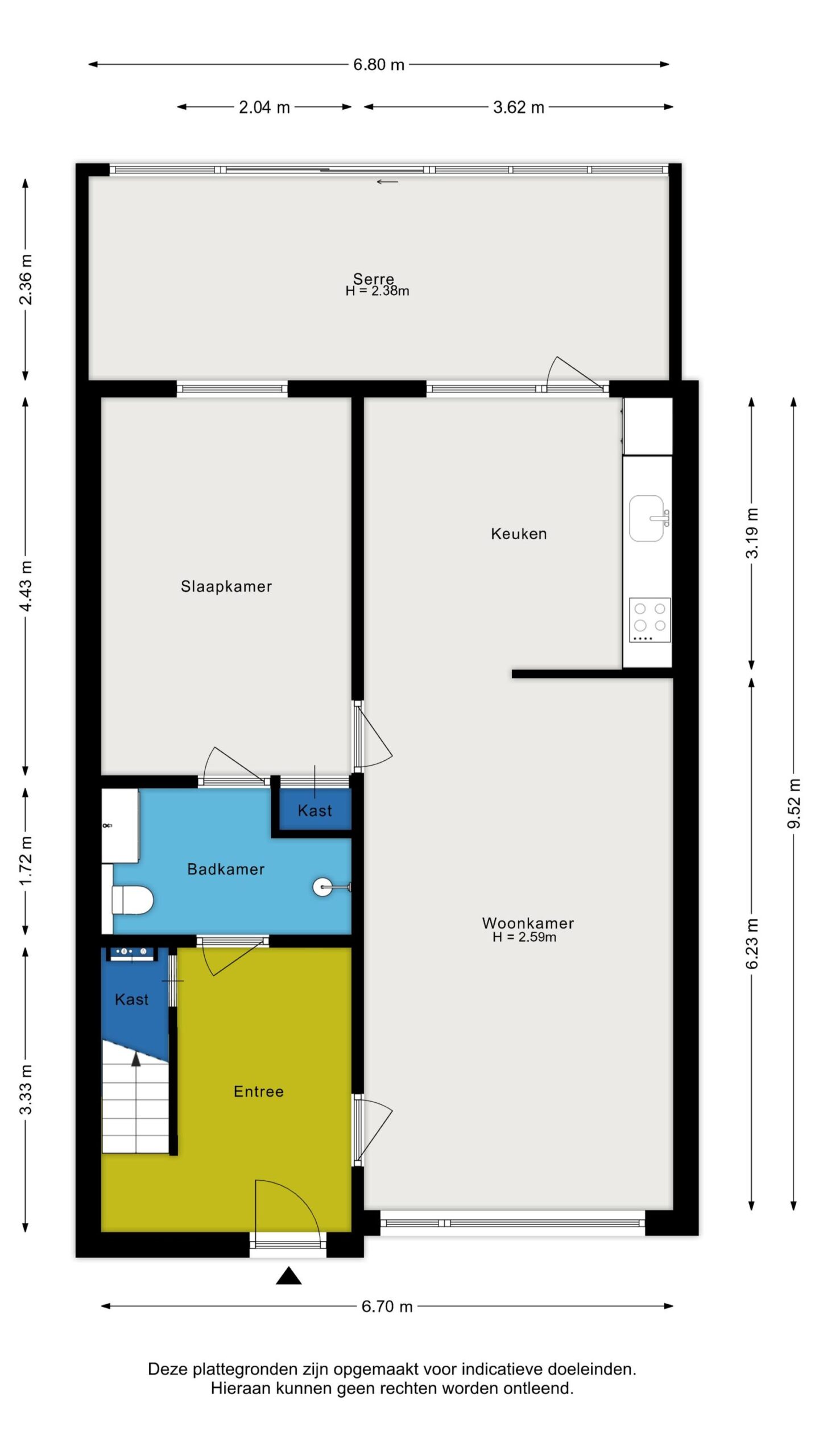 Via de voordeur loop je de ruim opgezette hal binnen. Hier vind je de garderobe en provisiekast onder de trap. Via de hal loop je naar de woonkamer of badkamer. De woonkamer bevindt zich aan de voorzijde en de open keuken aan de achterzijde. De keuken is uitgevoerd in een aanrechtblok met bovenkasten en divers inbouwapparatuur. De slaapkamer op de begane grond is royaal te noemen en beschikt over een vaste kast. Aansluitend de badkamer die voorzien is van een douche, toilet en wastafelmeubel. Via de keuken loop je de aangebouwde serre in, een fijne plek om van het buitenleven te genieten.
