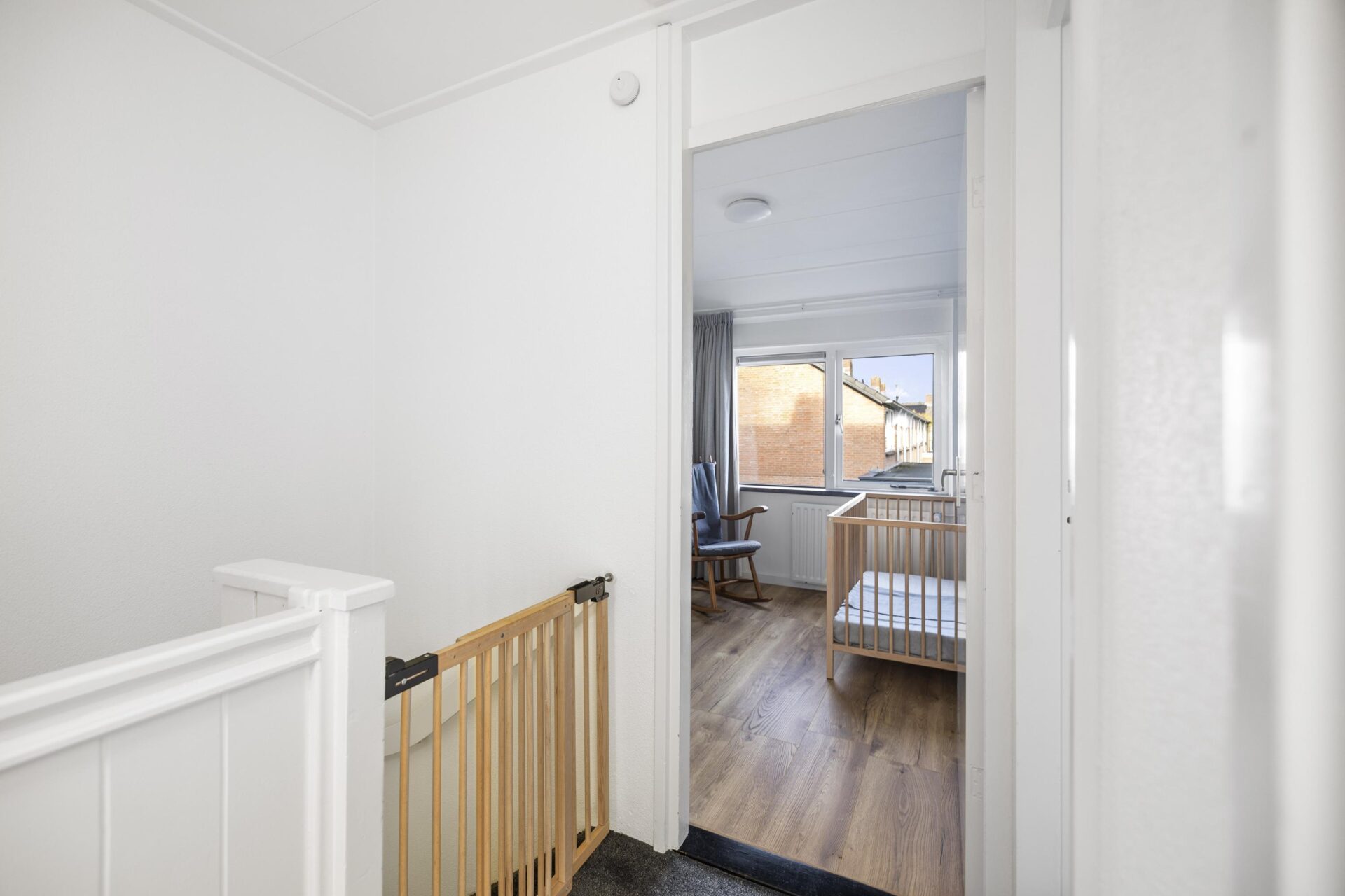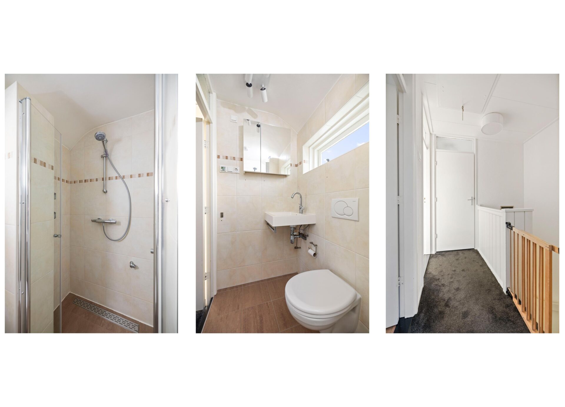 Op de eerste verdieping geeft de overloop toegang tot de badkamer en drie slaapkamers allen voorzien van vaste kasten. De badkamer is voorzien van een douche, toilet, wastafelmeubel en vloerverwarming. Via een vlizotrap op de overloop is de bevloerde vliering bereikbaar, ideaal voor extra opslagruimte.