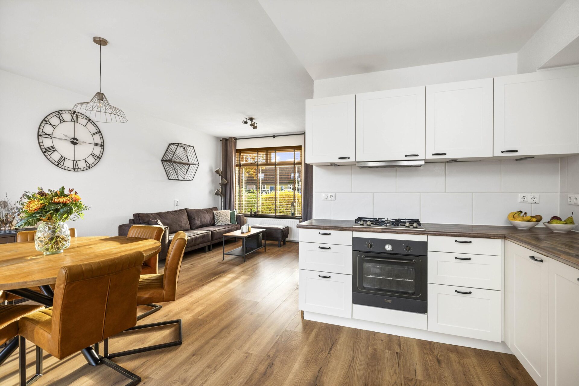 De voordeur geeft toegang tot de hal, hier is de meterkast, toilet, trap/kelderkast en trapopgang naar de verdieping. De woonkamer heeft zowel aan de voor- als achterzijde grote raampartijen wat zorgt voor veel lichtinval. Aan de voorzijde is het zithoekgedeelte en aan de achterzijde het eethoekgedeelte met deur naar de tuin. Aansluitend de hoekopgestelde, open keuken met inbouwapparatuur en toegang tot de praktische bijkeuken met opstelling C.V., wasapparatuur en toegang tot de tuin.