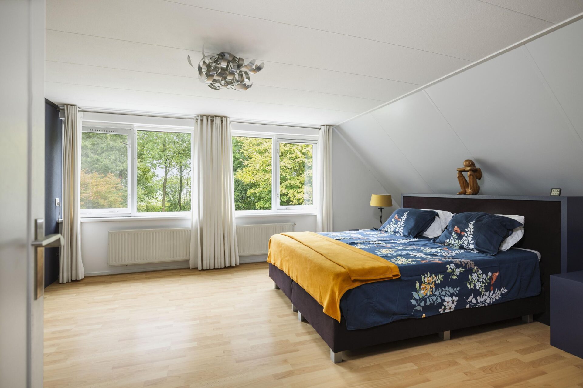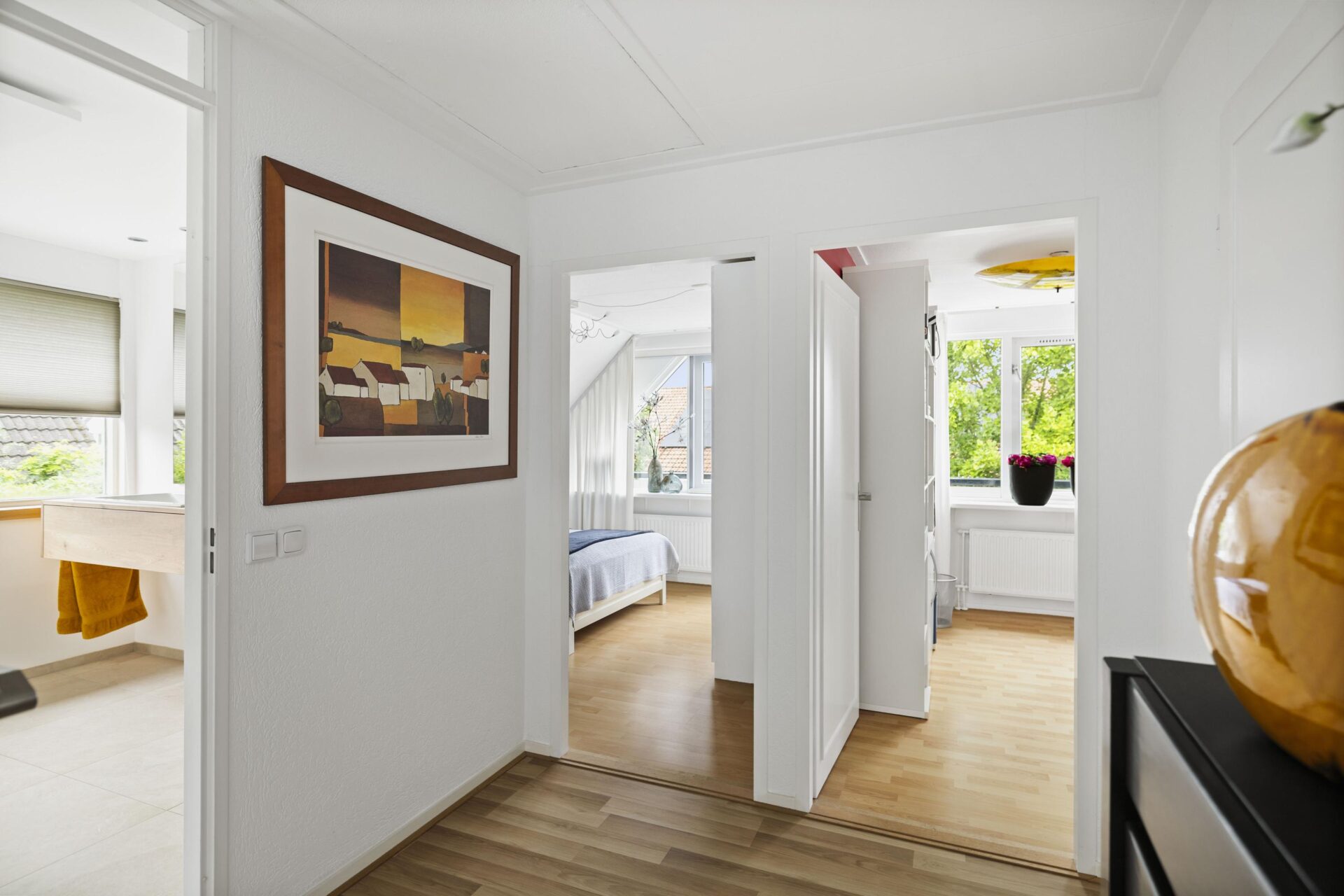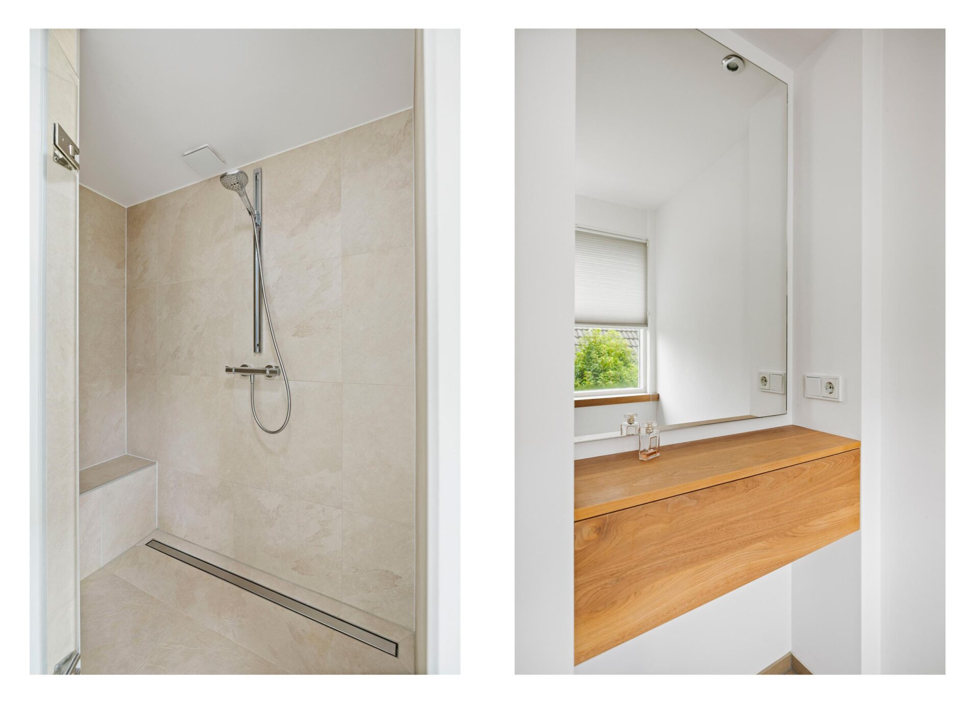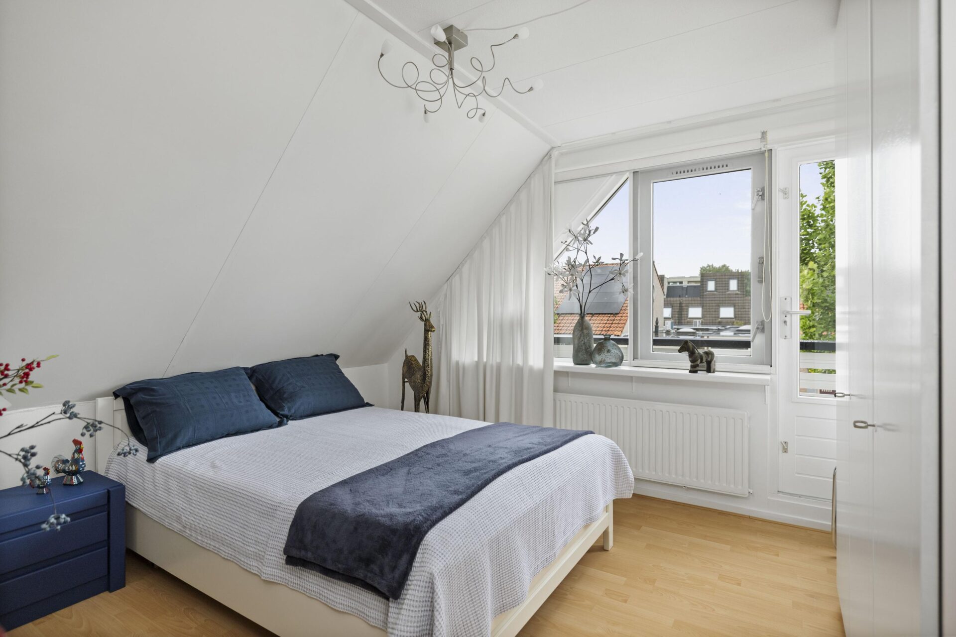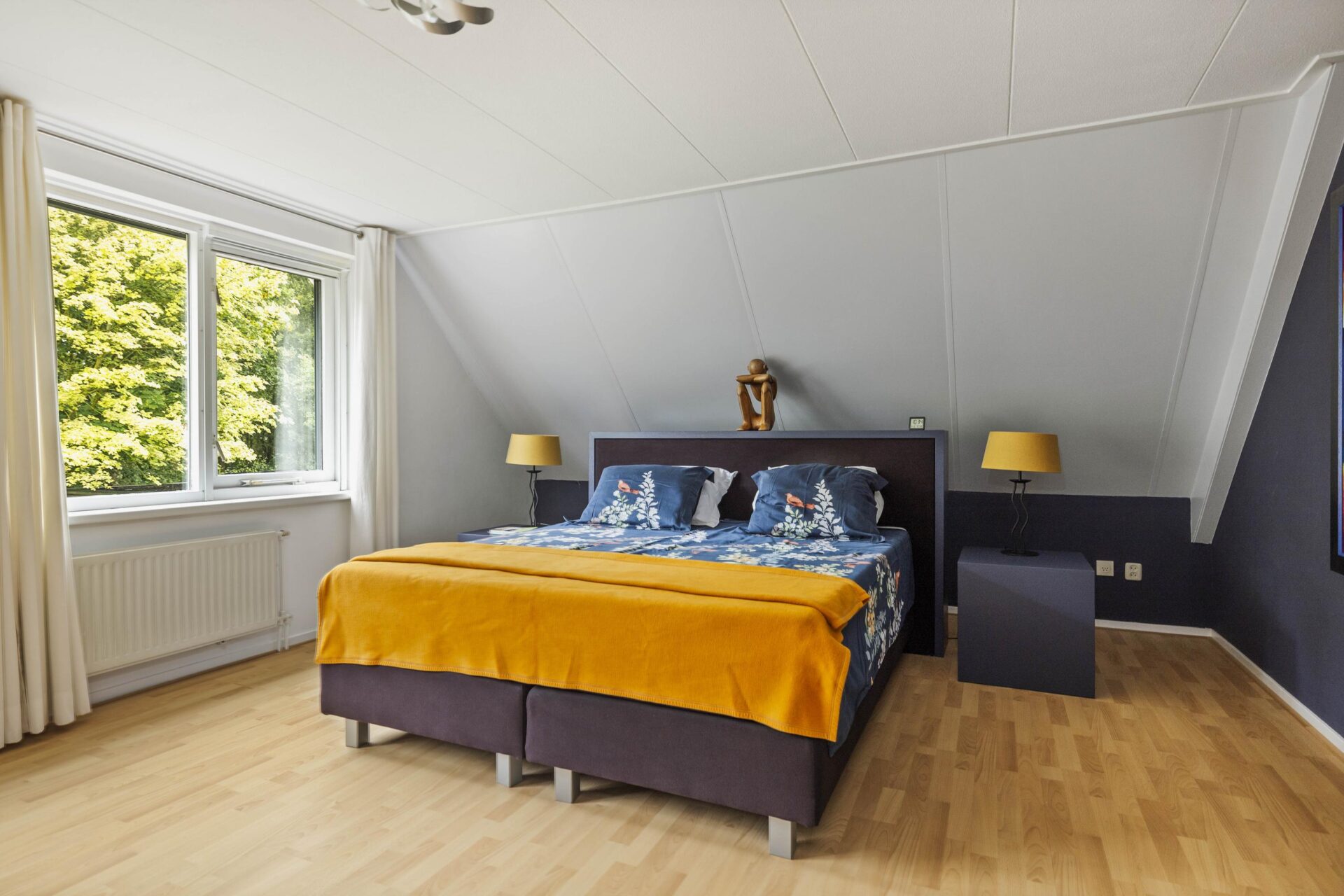 Op de eerste verdieping geeft de overloop toegang tot drie slaapkamers, badkamer en een wasruimte. Er zijn twee slaapkamers aan de voorzijde, beide van een prima formaat en waarvan 1 met toegang tot de loggia. Aan de achterzijde ligt de royale ouderslaapkamer met kastenwand. De badkamer is voorzien van een dakkapel, ruime inloopdouche met infrarood warmtepaneel, badkamermeubel en toilet. In de praktische wasruimte staat de wasmachine- en droger en de opstelling C.V. Op de overloop is een luik met trap naar de zolderverdieping met veel bergruimte.