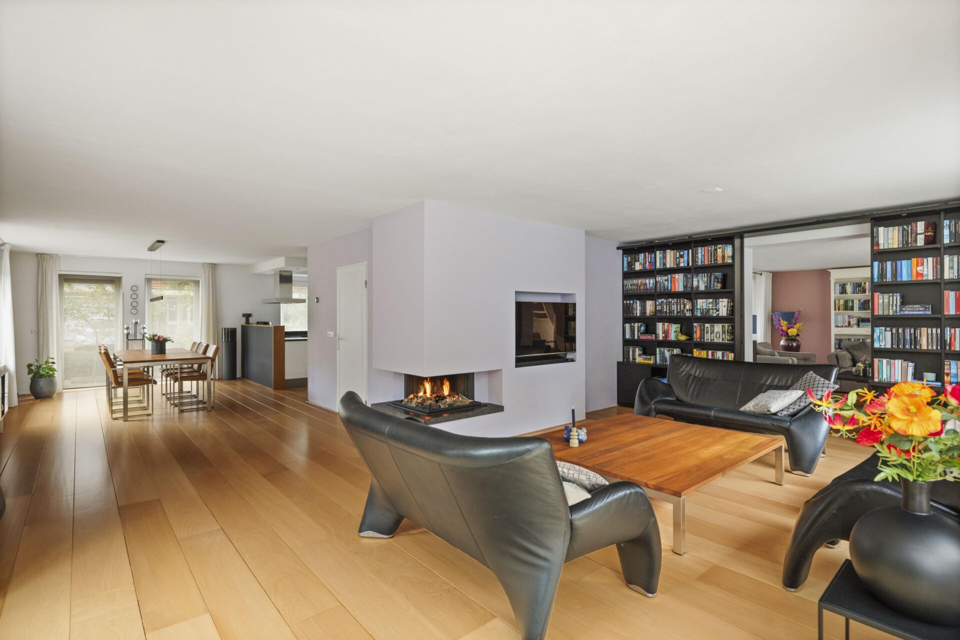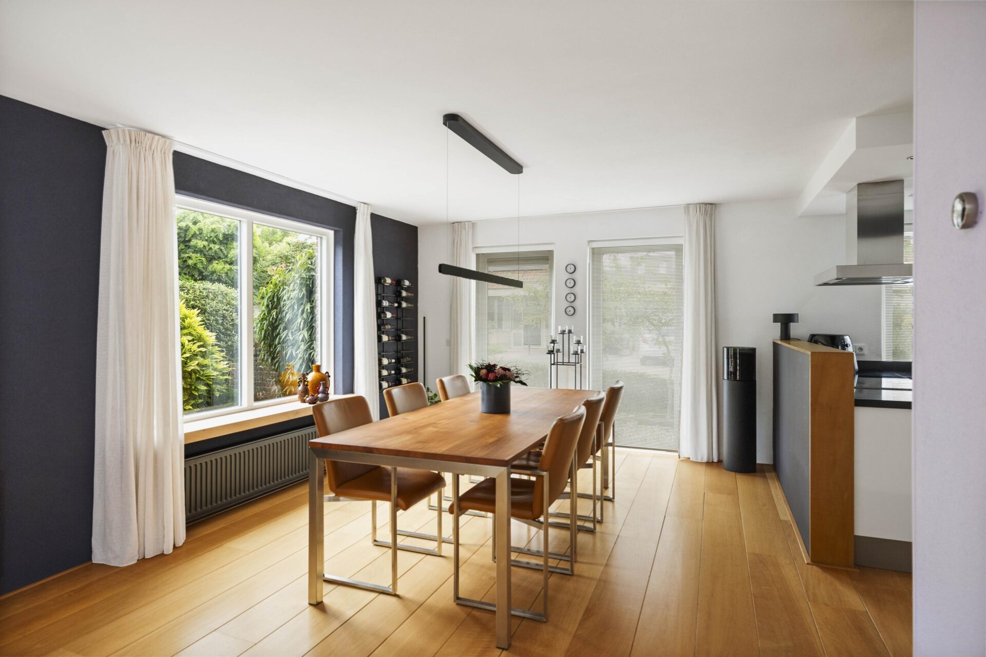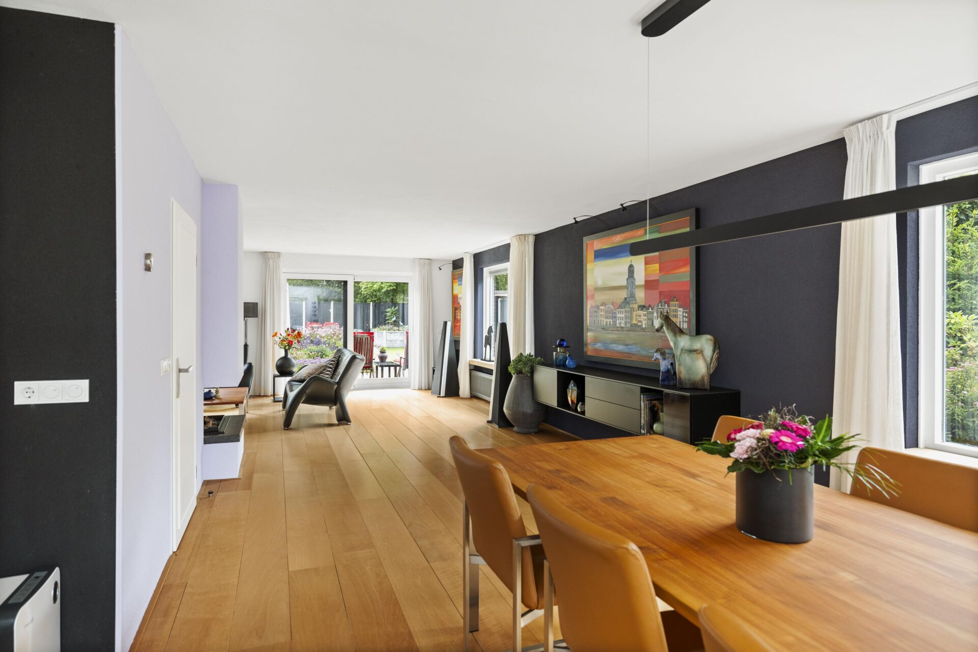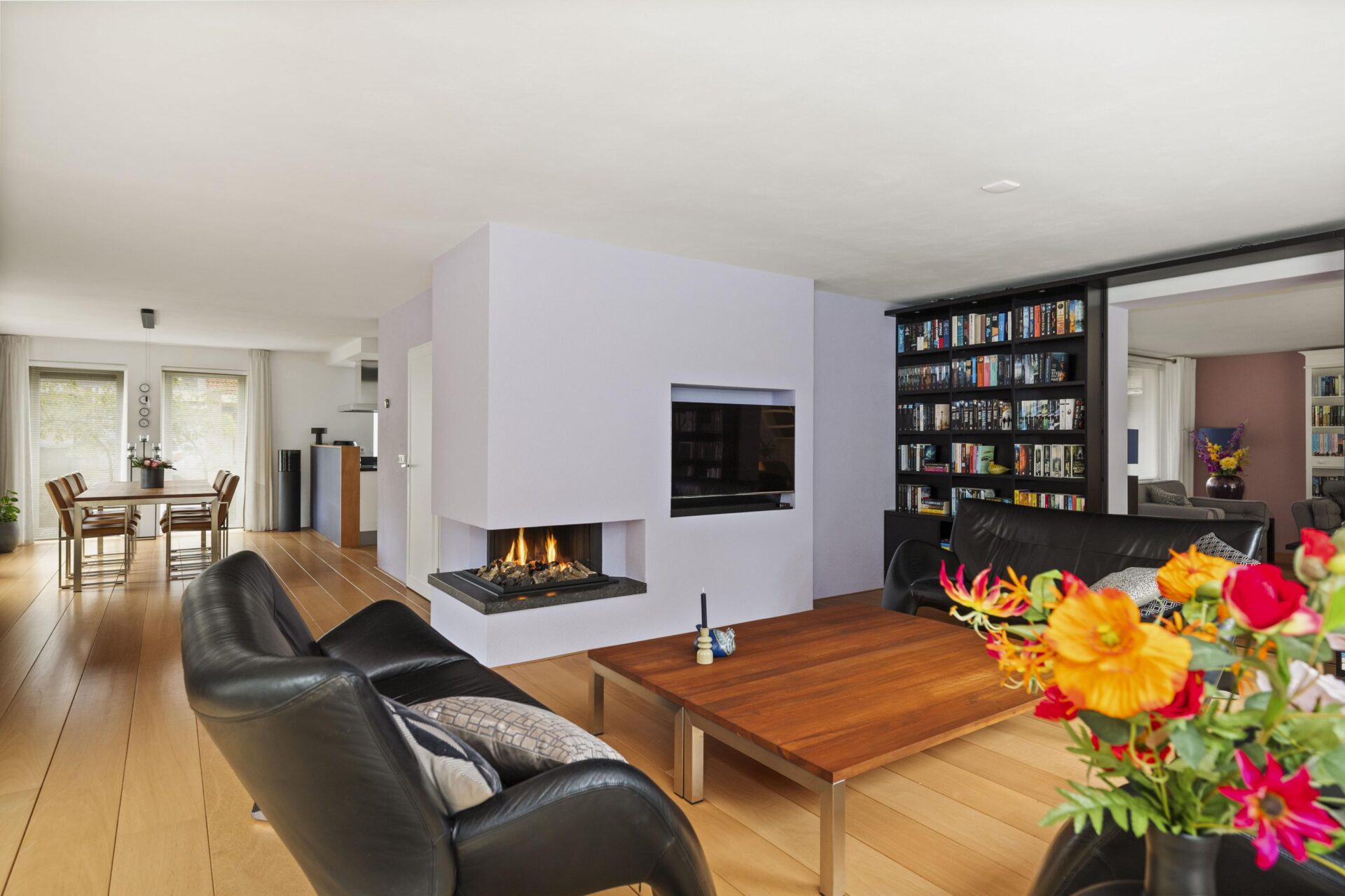 We komen binnen in de ruime hal met trapopgang, toilet en meterkast. De royale woonkamer heeft door de vele ramen een prettige lichtinval. Aan de achterzijde is het zithoekgedeelte met een fijn uitzicht op de tuin, sfeervolle gashaard en schuifpui naar het terras. Aan de voorzijde is het eethoekgedeelte met aansluitend de halfopen keuken voorzien van Quooker, inductiekookplaat met 6 zones en inbouwapparatuur. Vanuit de hal en de woonkamer is er toegang tot de tuinkamer welke gerealiseerd is in de voormalige garage. Een multifunctionele ruimte met schuifpui naar het terras en een vaste trap naar de zolderverdieping die momenteel in gebruik is als atelier/werkkamer.