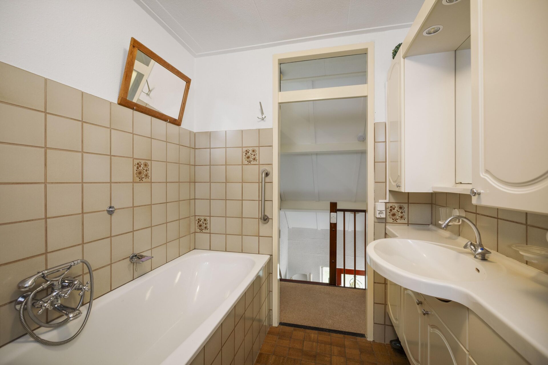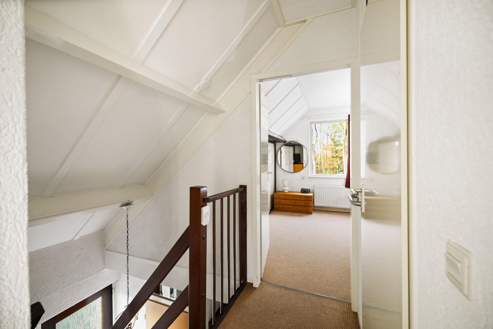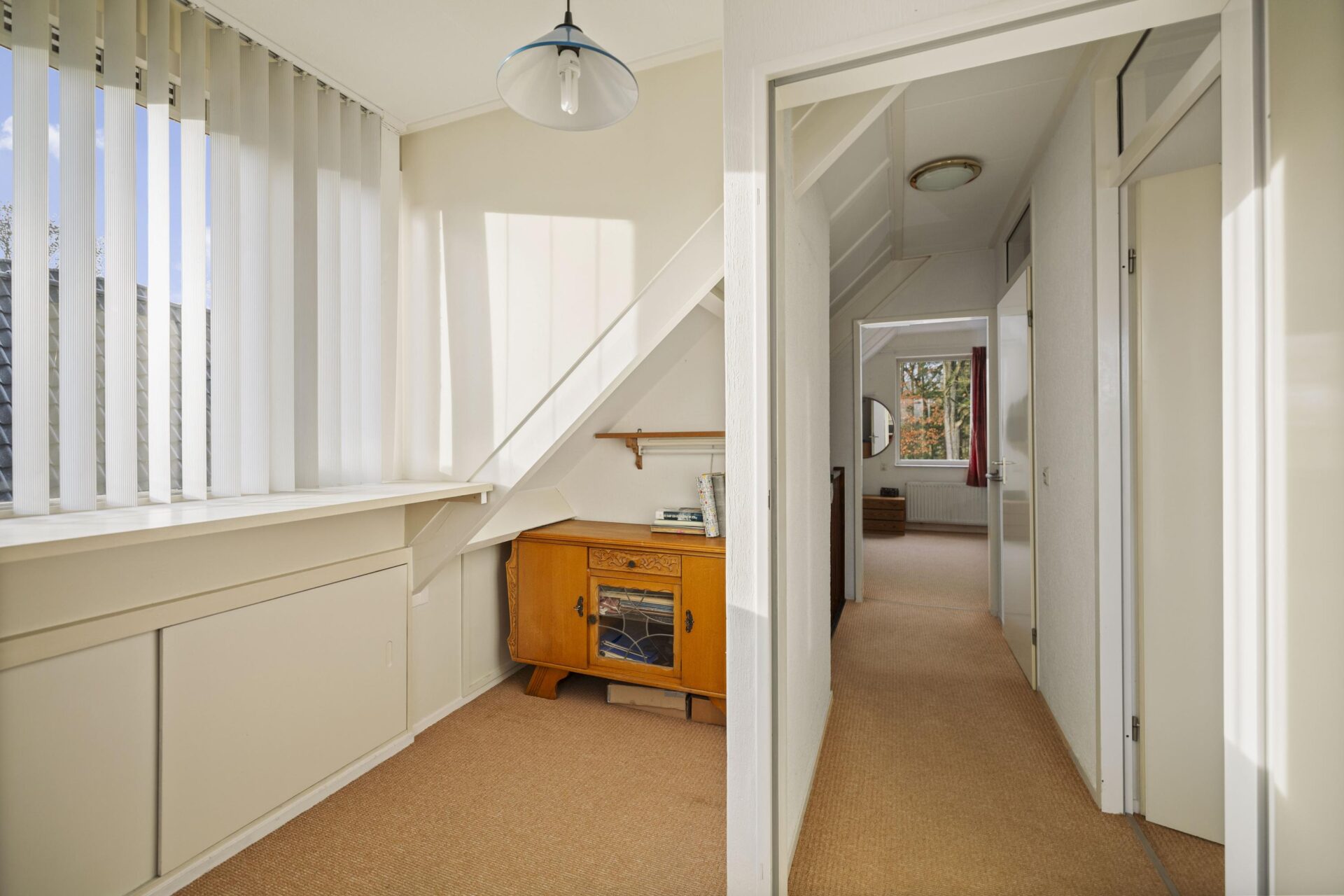 Op de eerste verdieping geeft de overloop toegang tot 3 slaapkamers. Aan de voorzijde zijn 2 slaapkamers, waarvan 1 met toegang tot het balkon en 1 met dakkapel en bergruimte onder de schuine kap. Aan de achterzijde is een royale slaapkamer met kastenwand, de originele badkamer is voorzien van een ligbad, douche, wastafelmeubel en toilet.