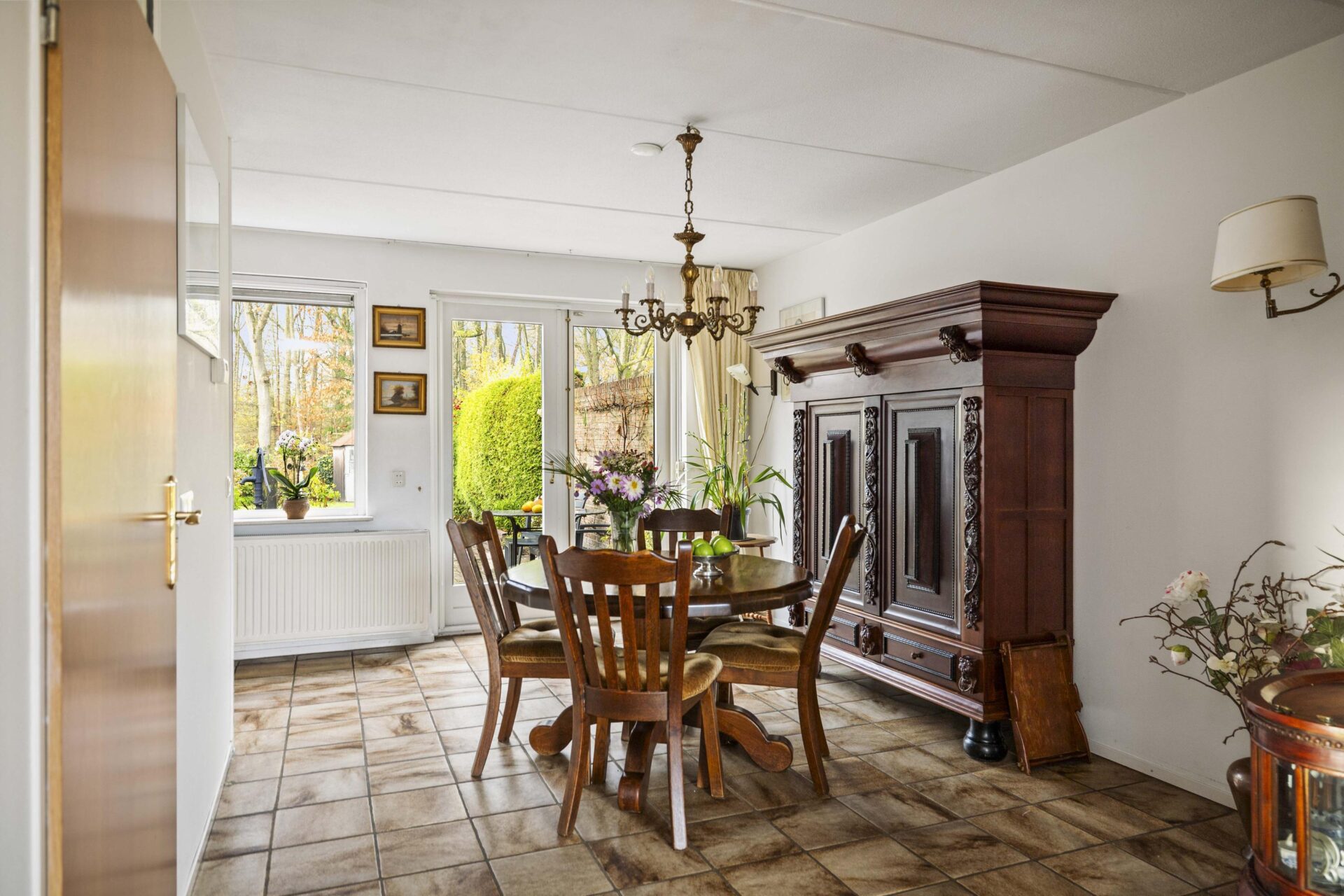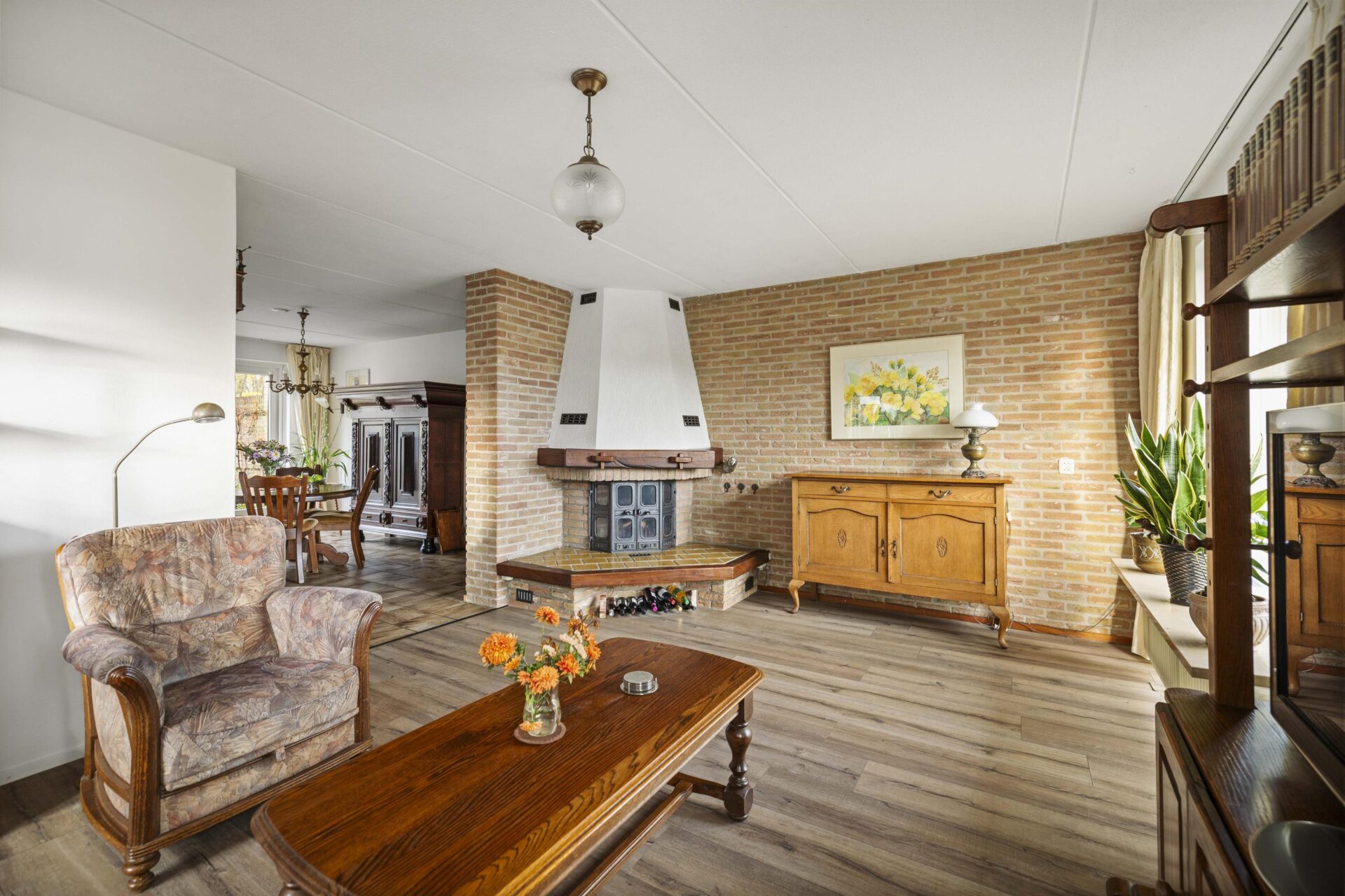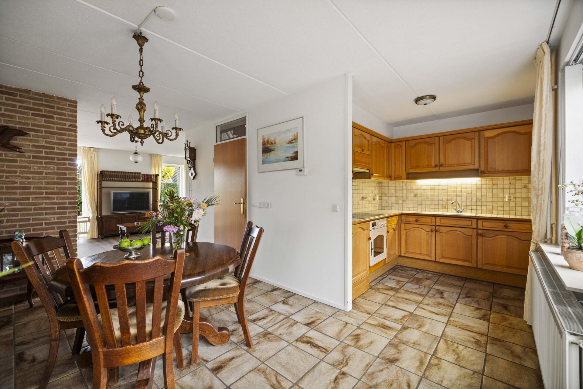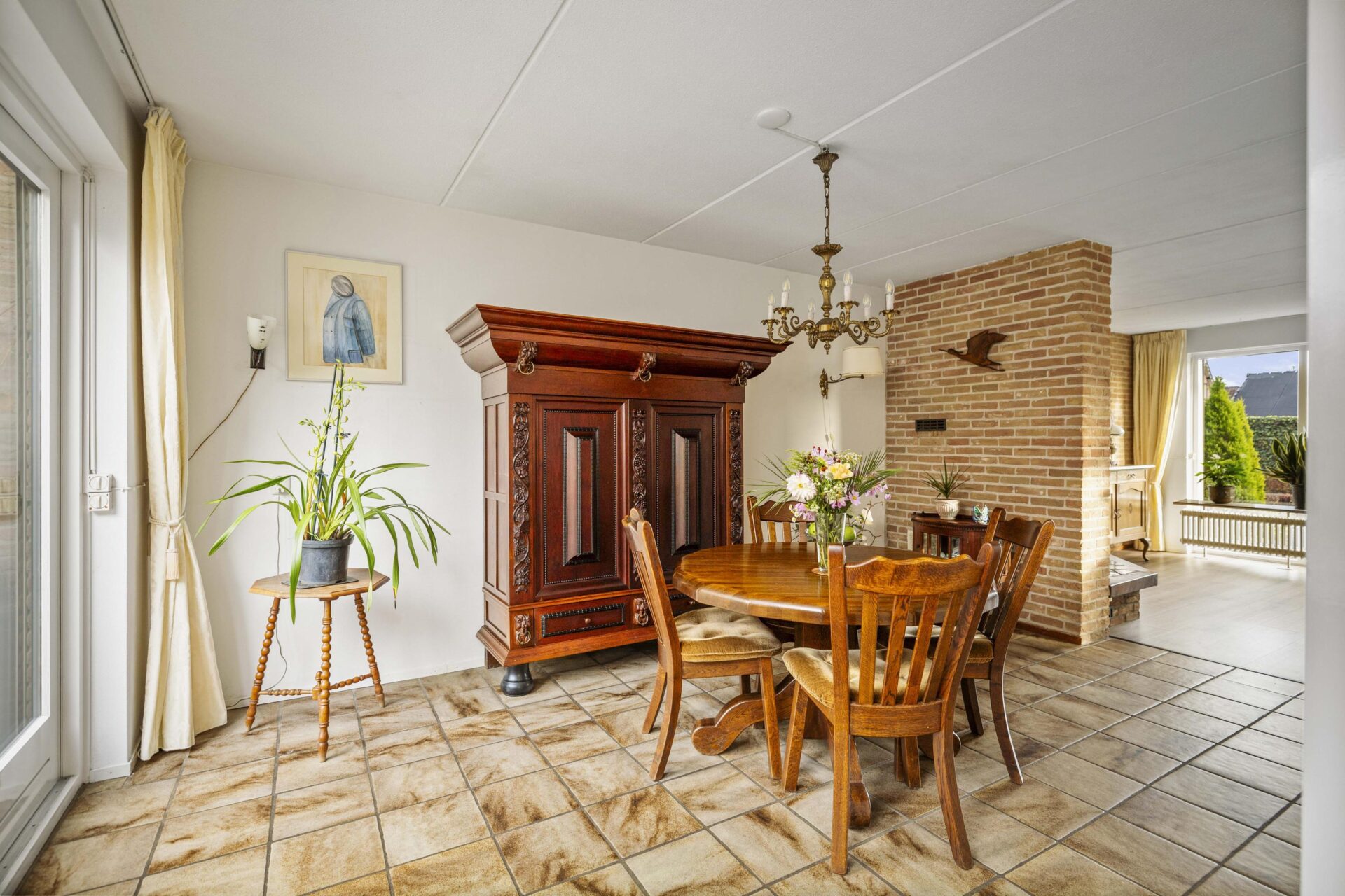 We komen binnen in de hal met toilet, meterkast en trapopgang naar de verdieping. De woonkamer bestaat uit een zithoekgedeelte aan de voorzijde met open haardpartij en een eethoekgedeelte aan de achterzijde met openslaande deuren naar het terras. Aansluitend de open keuken, deze is gedateerd maar wel functioneel. Praktisch is de aangebouwde bijkeuken met extra aanrechtblokje, wasmachine- en drogeropstelling en toegang tot de garage en de tuin.