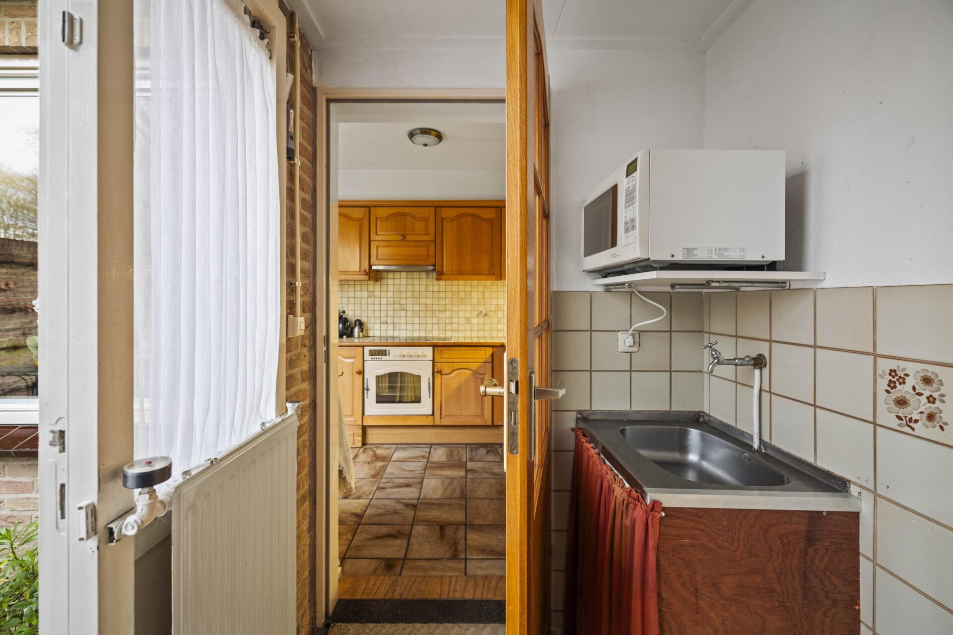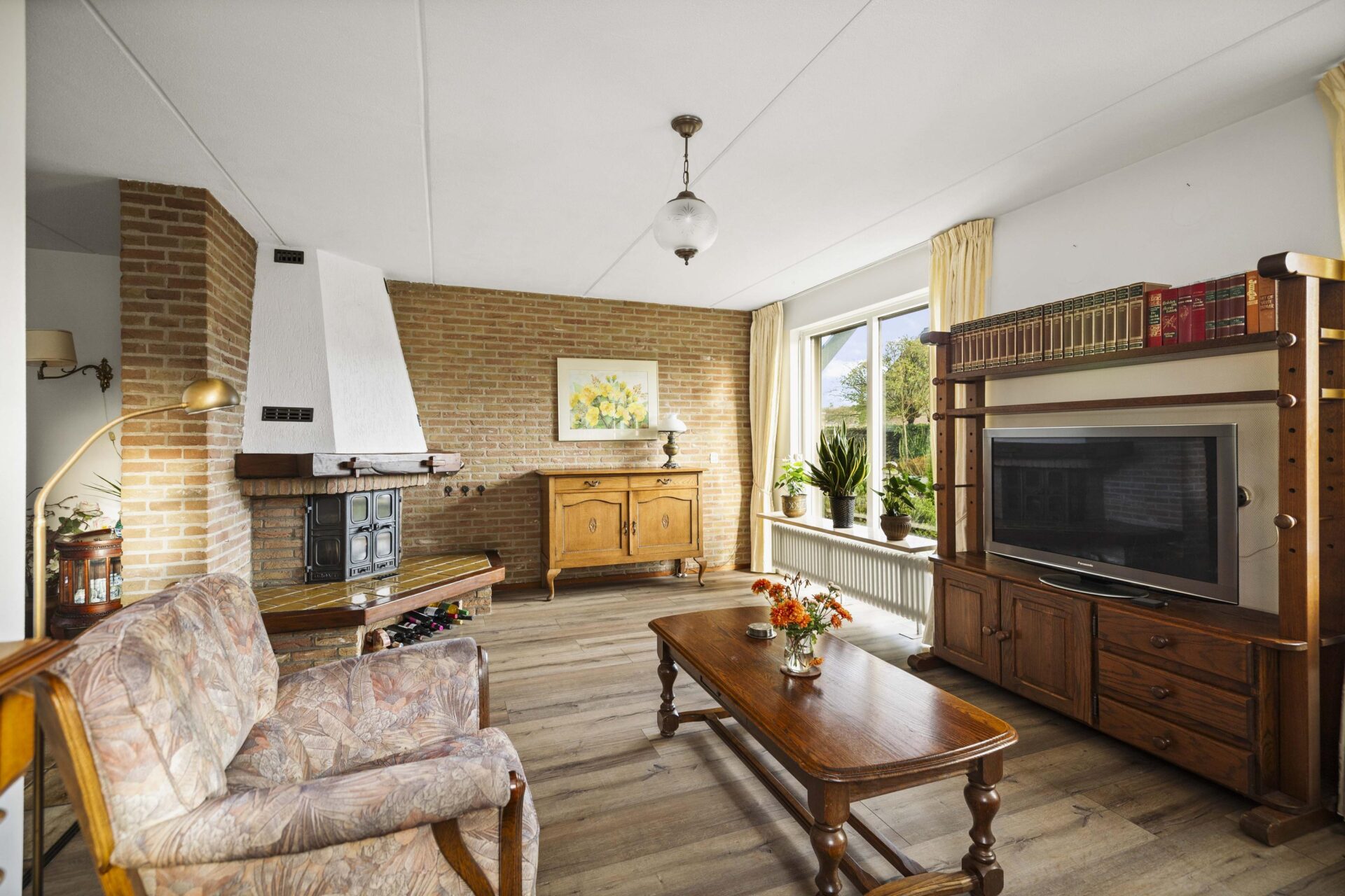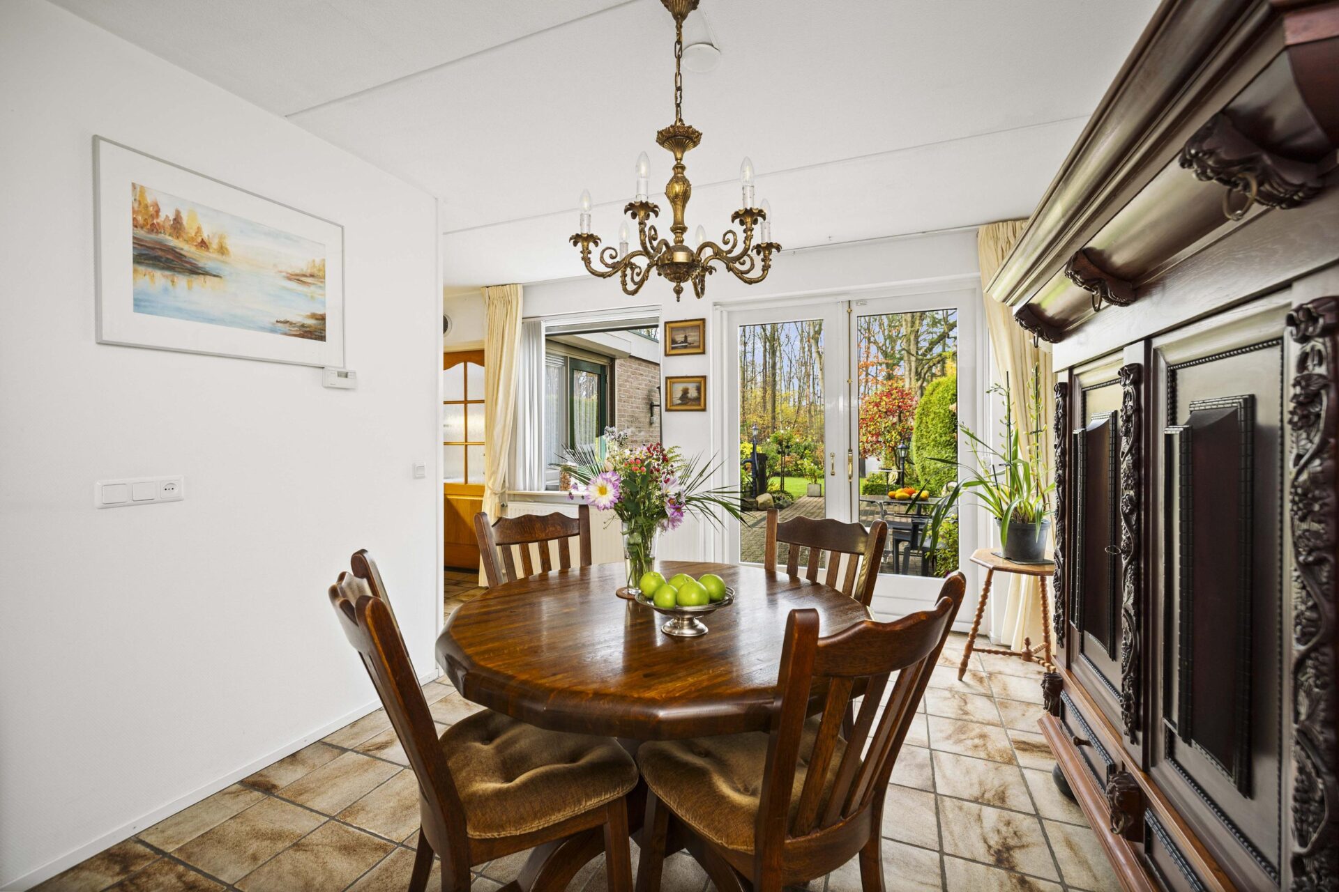 We komen binnen in de hal met toilet, meterkast en trapopgang naar de verdieping. De woonkamer bestaat uit een zithoekgedeelte aan de voorzijde met open haardpartij en een eethoekgedeelte aan de achterzijde met openslaande deuren naar het terras. Aansluitend de open keuken, deze is gedateerd maar wel functioneel. Praktisch is de aangebouwde bijkeuken met extra aanrechtblokje, wasmachine- en drogeropstelling en toegang tot de garage en de tuin.