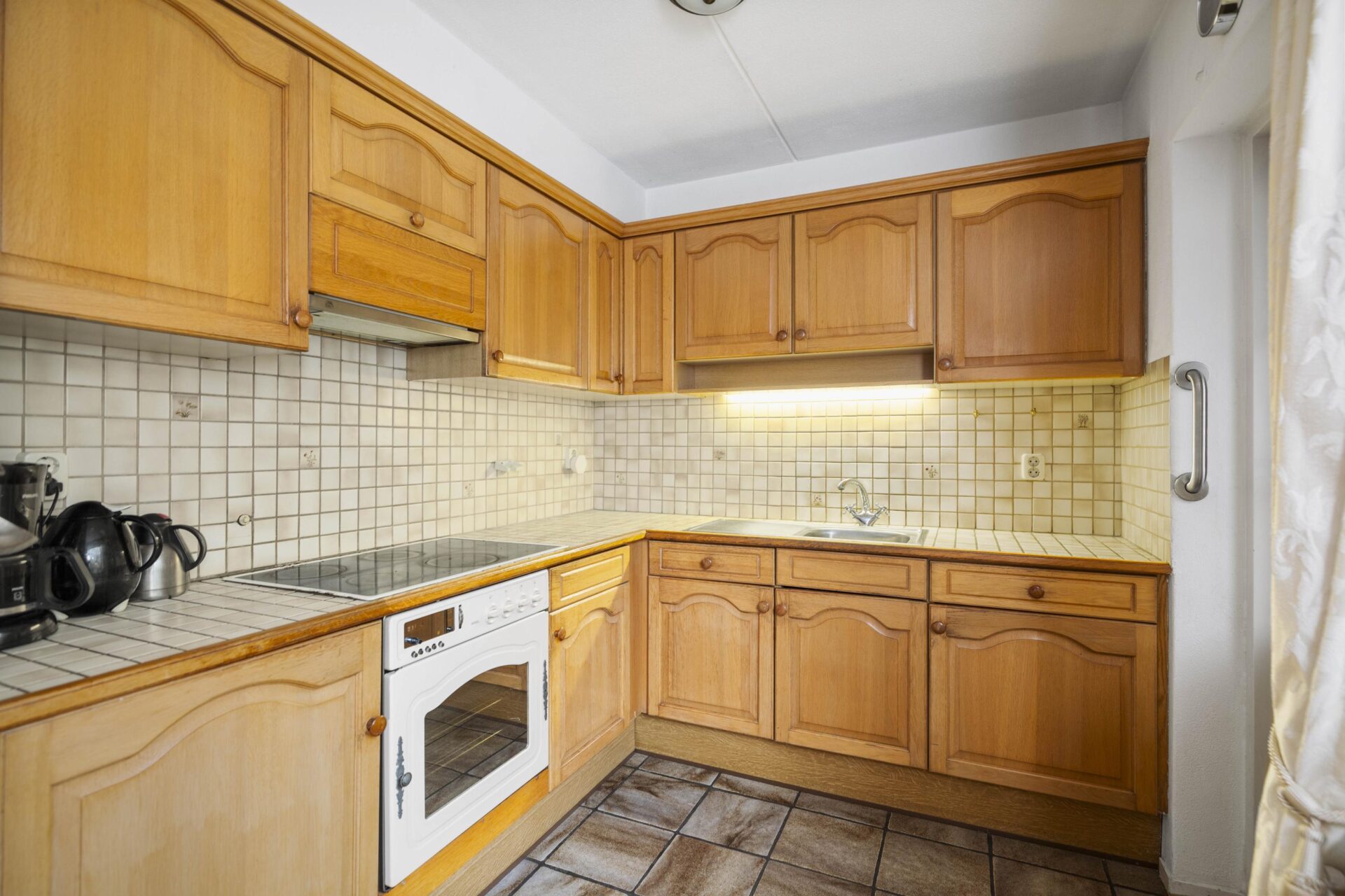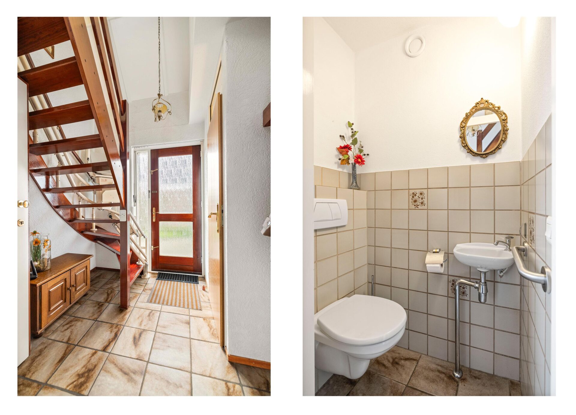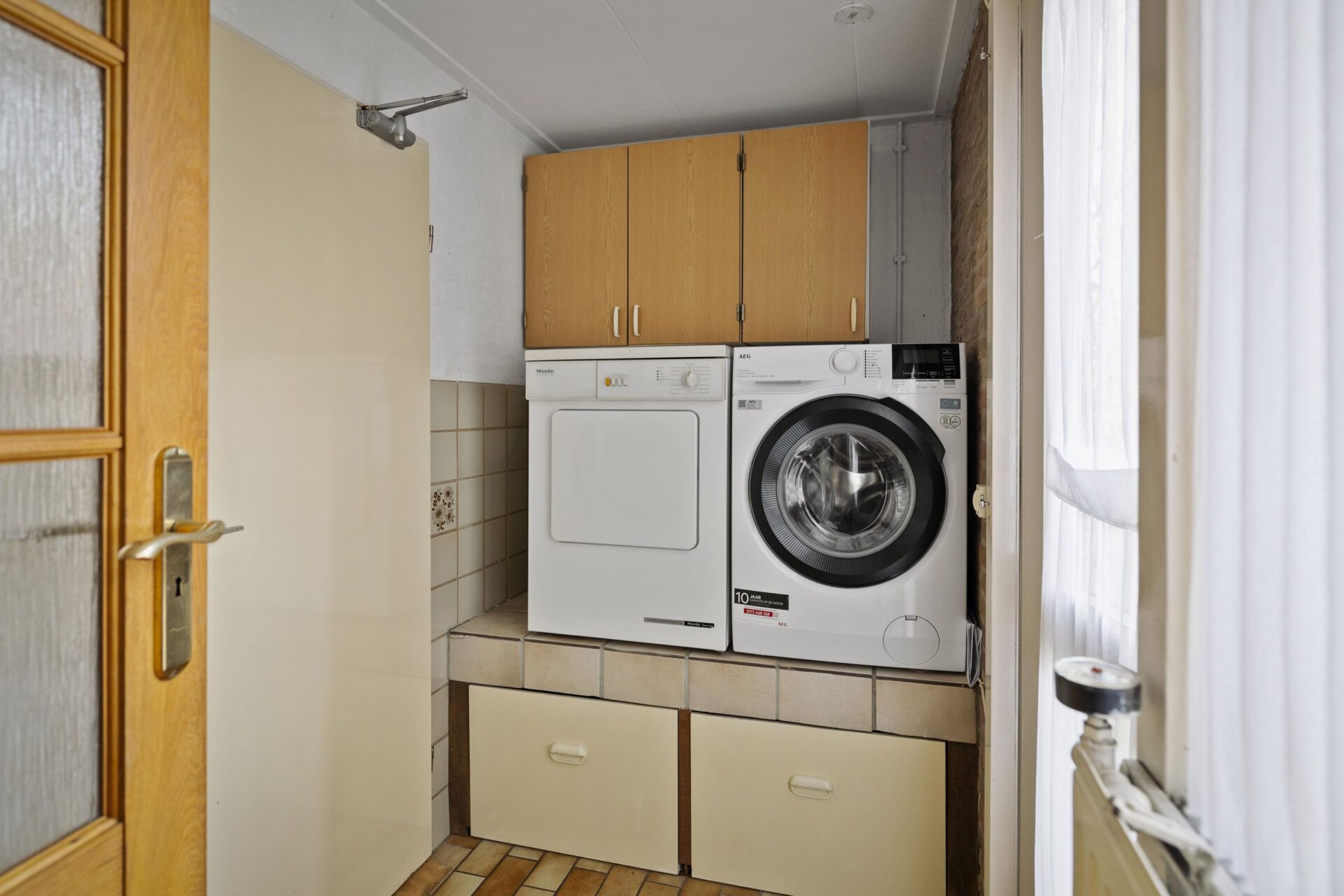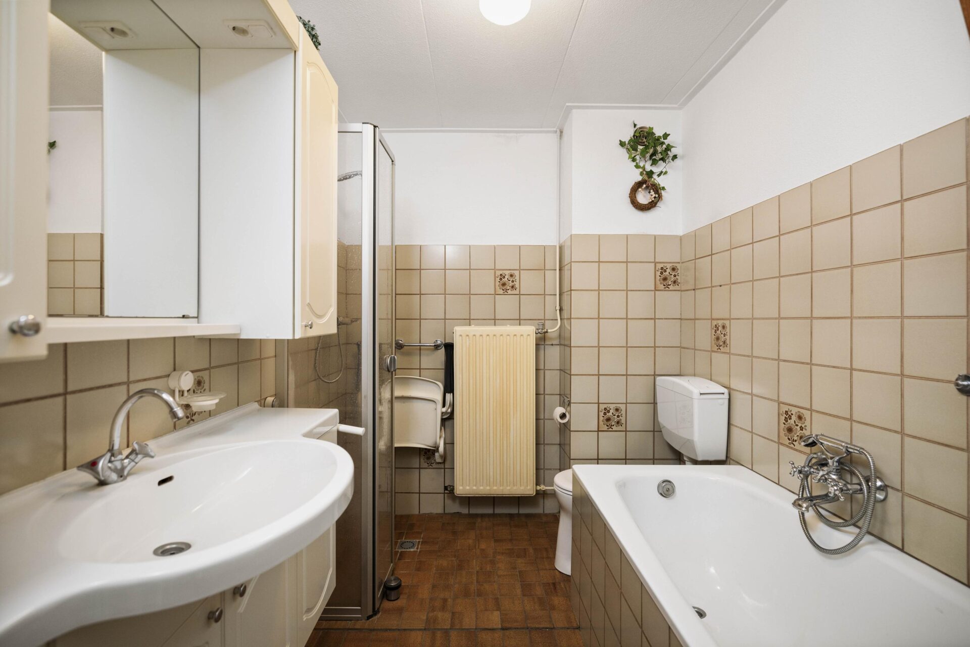 We komen binnen in de hal met toilet, meterkast en trapopgang naar de verdieping. De woonkamer bestaat uit een zithoekgedeelte aan de voorzijde met open haardpartij en een eethoekgedeelte aan de achterzijde met openslaande deuren naar het terras. Aansluitend de open keuken, deze is gedateerd maar wel functioneel. Praktisch is de aangebouwde bijkeuken met extra aanrechtblokje, wasmachine- en drogeropstelling en toegang tot de garage en de tuin.