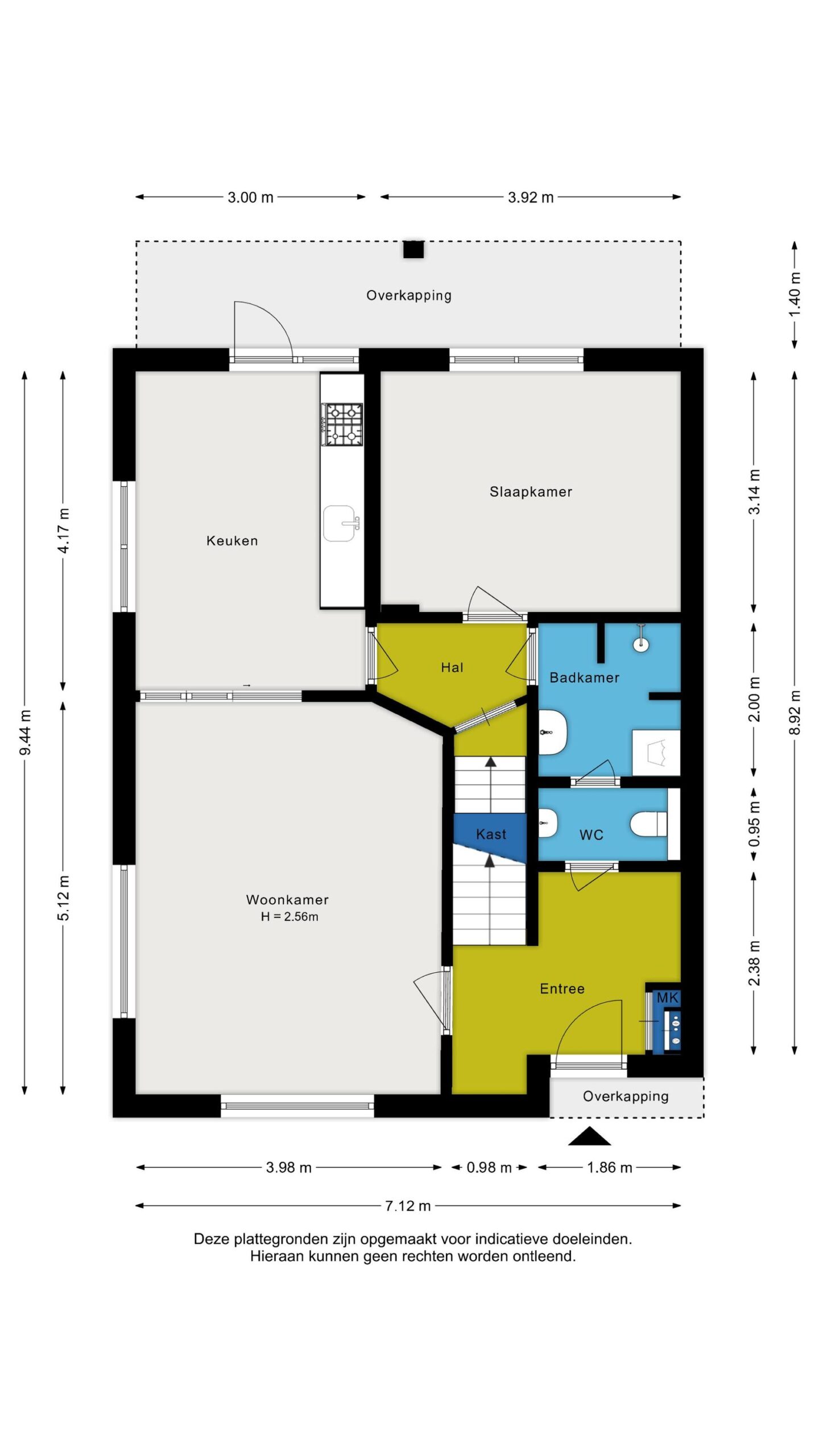 Via de voordeur kom je in de hal met meterkast, toilet (tevens vanuit de badkamer bereikbaar) en trapopgang. Vanuit de hal is de woonkamer bereikbaar, deze ligt aan de voorzijde en beschikt over veel lichtinval door de grote raampartijen. De woonkeuken ligt aan de achterzijde en is afsluitbaar d.m.v. een schuifdeur. Vanuit de keuken is er toegang tot de tuin en het tussenportaal met trap/kelderkast, vanuit het tussenportaal is de slaapkamer en badkamer bereikbaar. De badkamer is voorzien van een douche, wastafel en wasmachine-aansluiting.