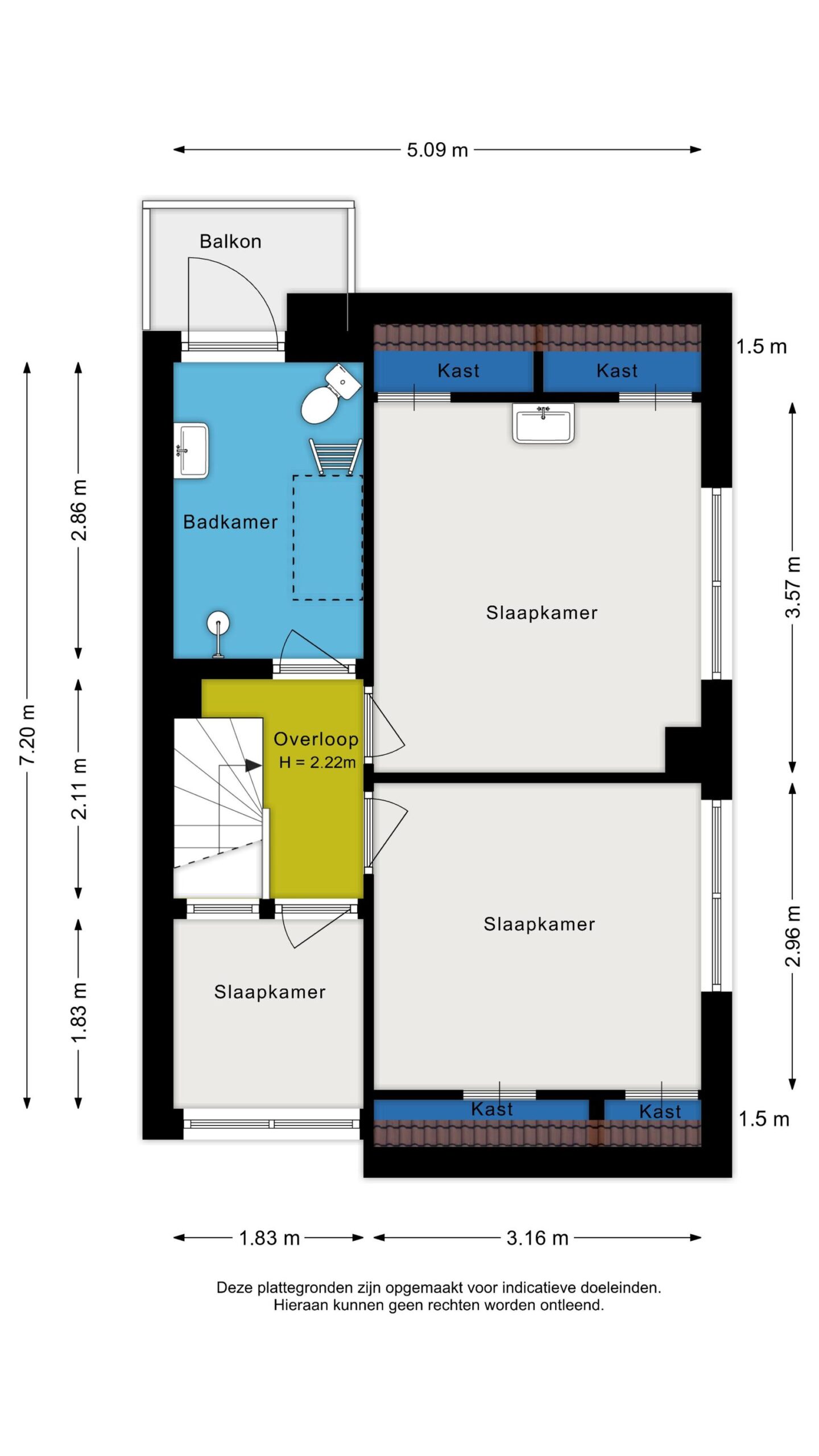 Op de eerste verdieping zijn via de overloop de badkamer en 3 slaapkamers bereikbaar. Er zijn 2 slaapkamers aan de voorzijde waarvan 1 met vaste kasten. Aan de achterzijde is de derde ruime slaapkamer met wastafel en vaste kasten. De keurige badkamer is voorzien van een douche, wastafel, toilet en toegang tot het balkon.