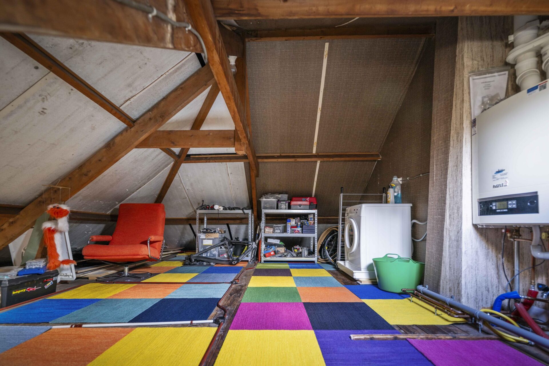 Via een vlizotrap in de badkamer is de zolderverdieping bereikbaar. Hier is een grote open ruimte met bergruimte, opstelling C.V. en wasmachine-opstelling.