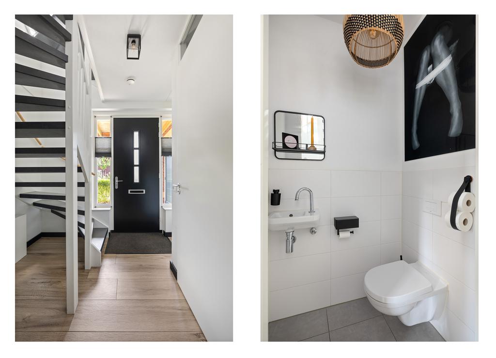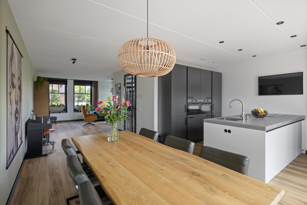 Door de woning heen: Via de voordeur kom je de hal binnen hier is de garderobe, meterkast, het toilet en de trapopgang naar de verdieping. De ruime woonkamer is gesitueerd aan de voorzijde van de woning. Dit is een prettige ruimte met een fijne lichtinval. De keuken en eetkamer zijn aan de achterkant, de tuinzijde, gesitueerd. De grote ramen zorgen voor een overvloed aan natuurlijk licht en bieden een vrij uitzicht op de groene omgeving.