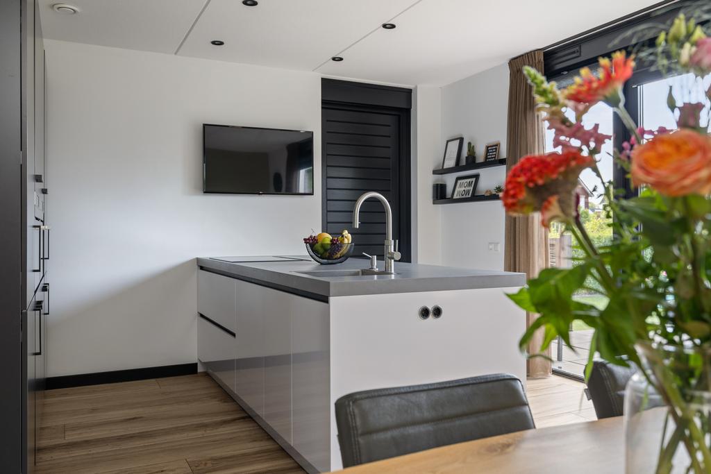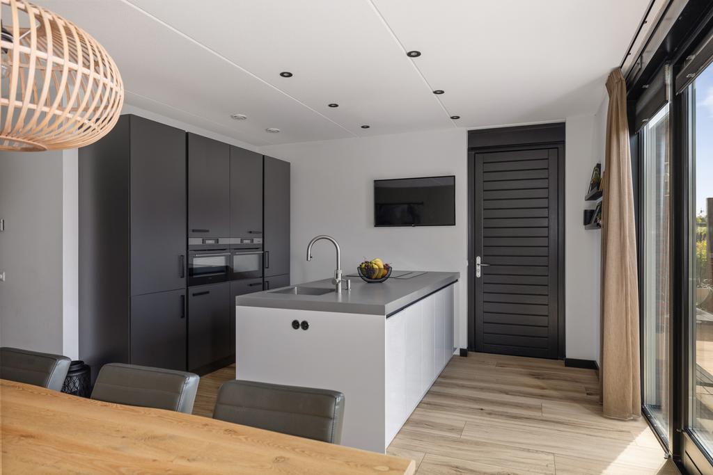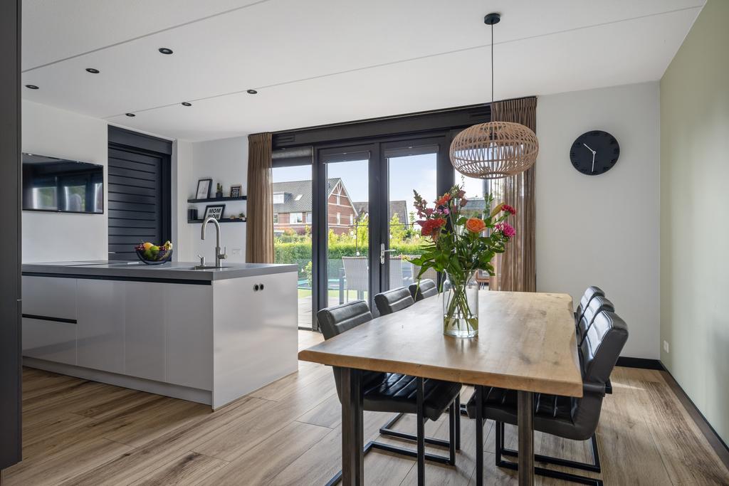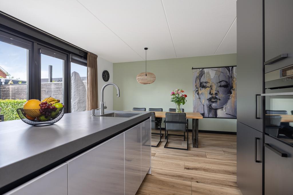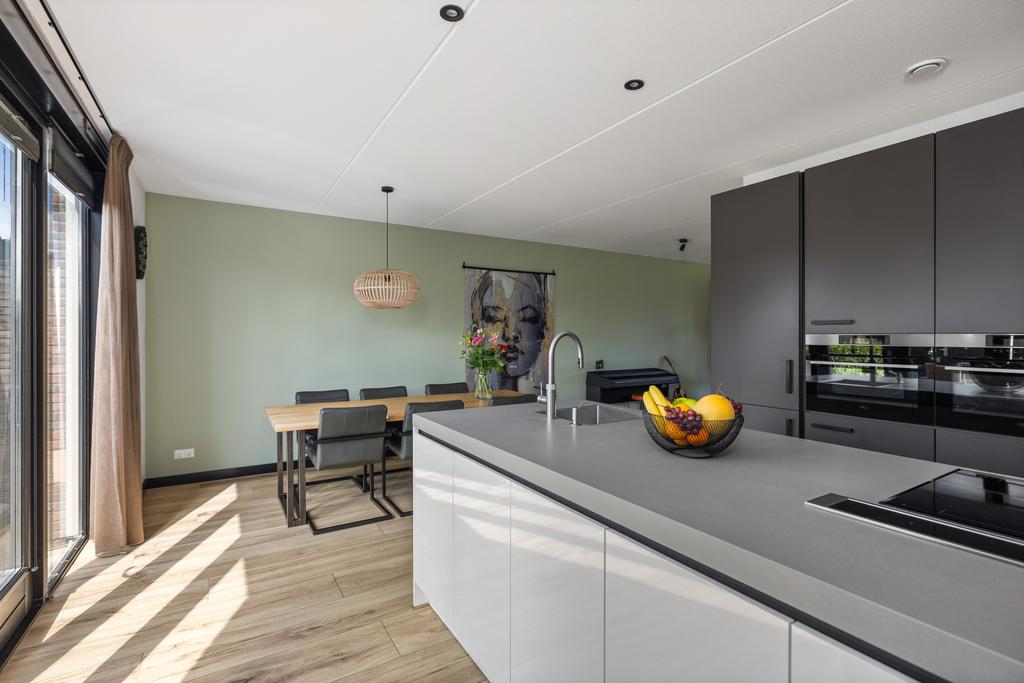 De keuken is van alle gemakken voorzien en is uitgevoerd in een moderne donkere kleurstelling, een schiereiland en er is voldoende kastruimte aanwezig. Vanuit de keuken loop je de aangebouwde garage/berging binnen. Via openslaande tuindeuren in de keuken is het terras in de tuin bereikbaar.
