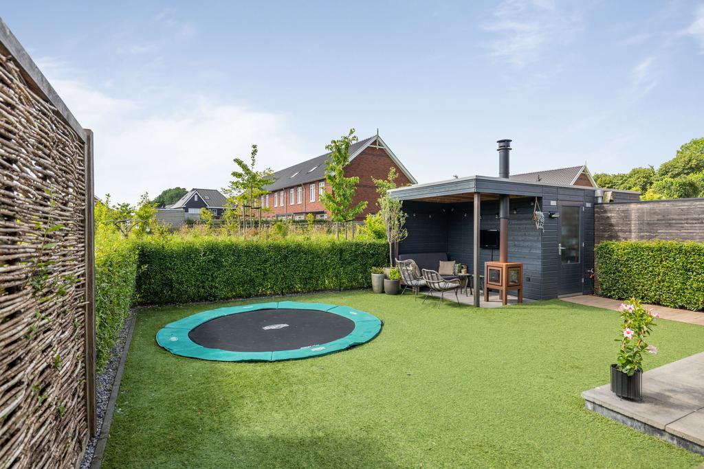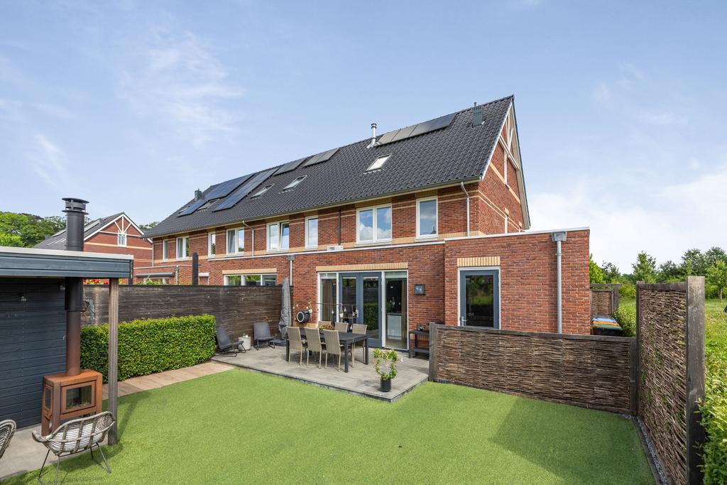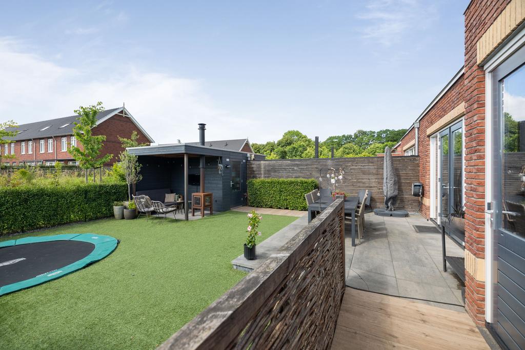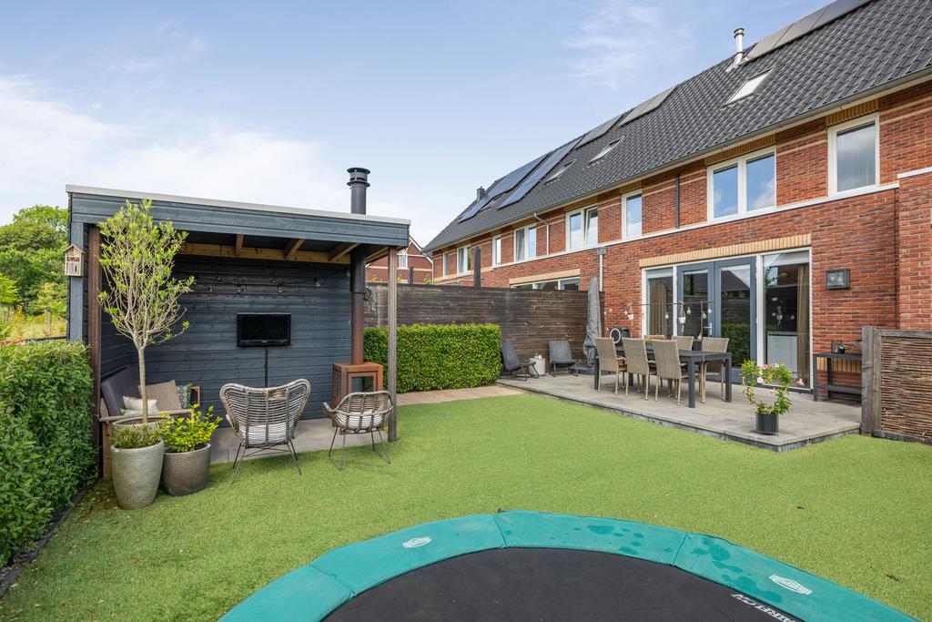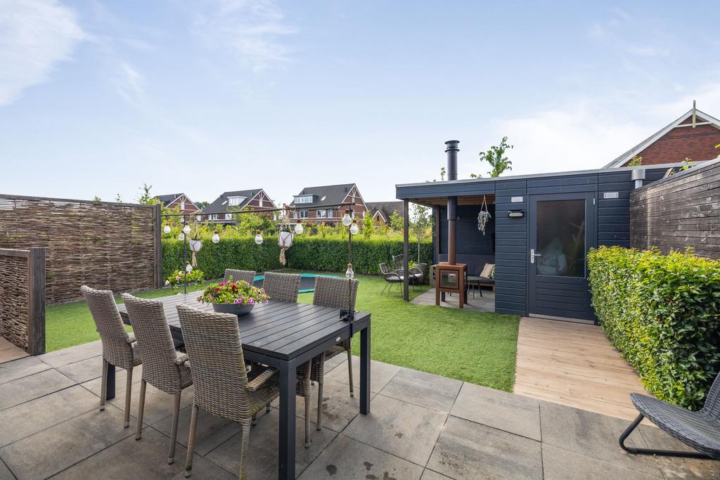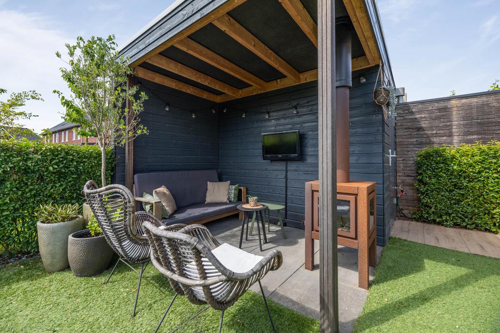 De achtertuin is gesitueerd op het zuiden, een aangename zonligging! Door de vrije ligging aan de achterkant kun je heerlijk wegkijken. In de tuin is een houten berging gerealiseerd, hier is bergruimte voor bijvoorbeeld tuingereedschap. Aan de berging zit een veranda met houtkachel waar je fijn kunt zitten op de lange zomeravonden.