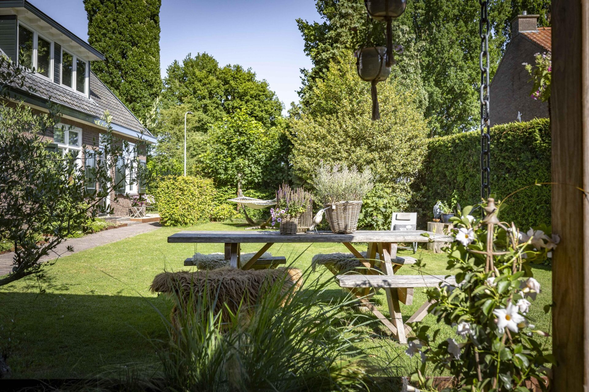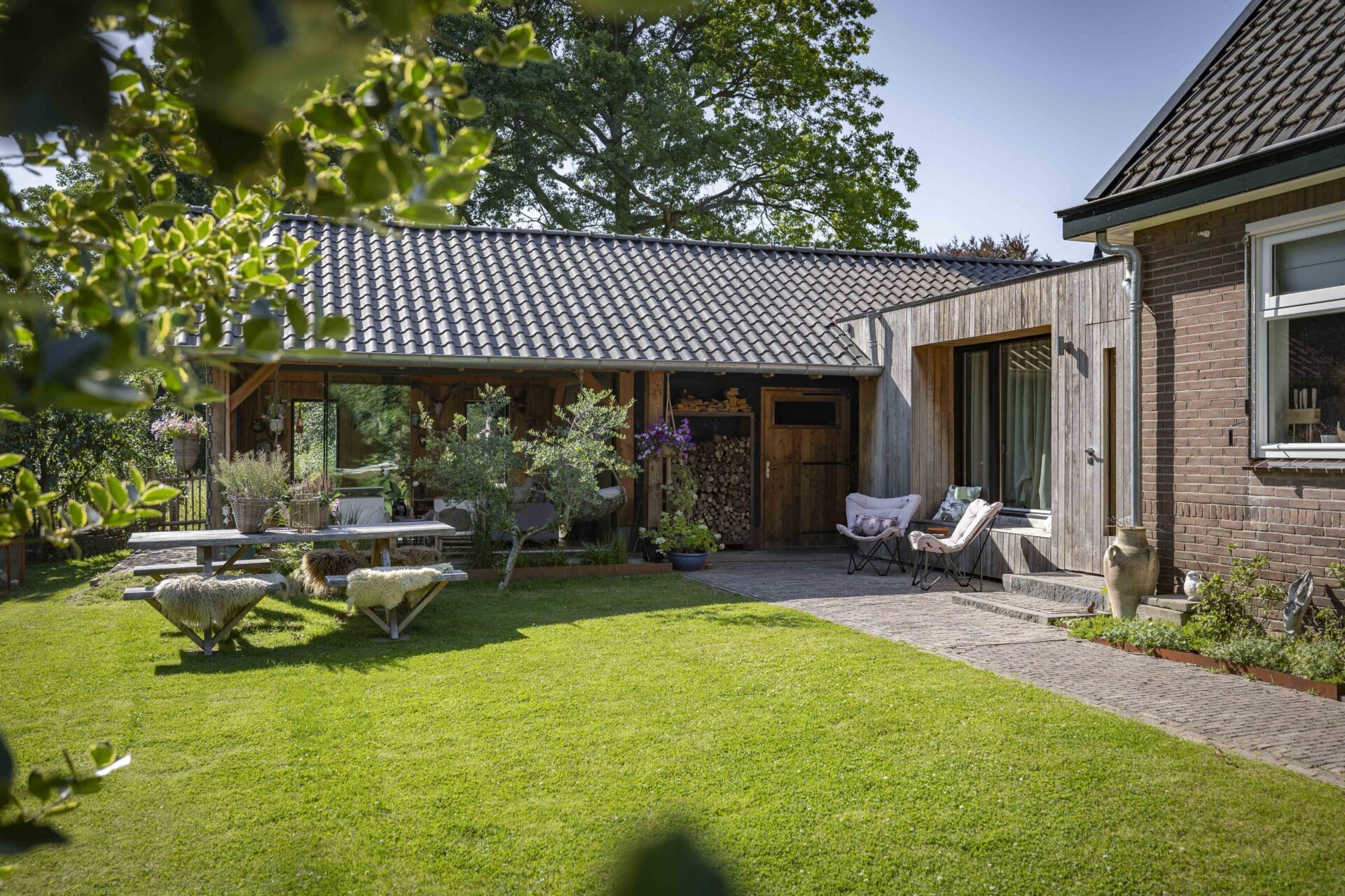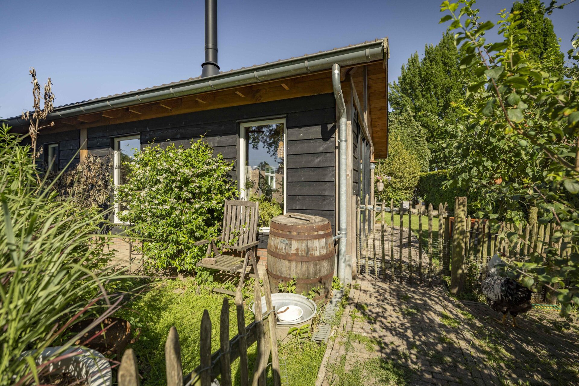 De tuin is verrassend ruim en gelegen aan de zijkant van de woning. Dankzij de ligging op het zuiden geniet je hier volop van de zon. Veel groen, een gazon en meerdere fijne plekken om te zitten maken dit een heerlijke buitenruimte. Achter in de tuin staat een grote houten schuur met tuinkamer: een sfeervolle plek met glazen wanden waar je het hele jaar door kunt genieten van je eigen groene omgeving. Met aan de achterzijde uitzicht op de kippenren waar je elke ochtend verse eitjes kunt pakken. Parkeren is geen probleem: op eigen terrein is ruimte voor twee auto’s.