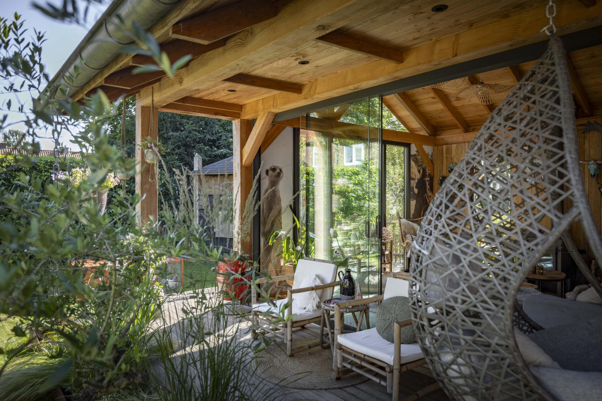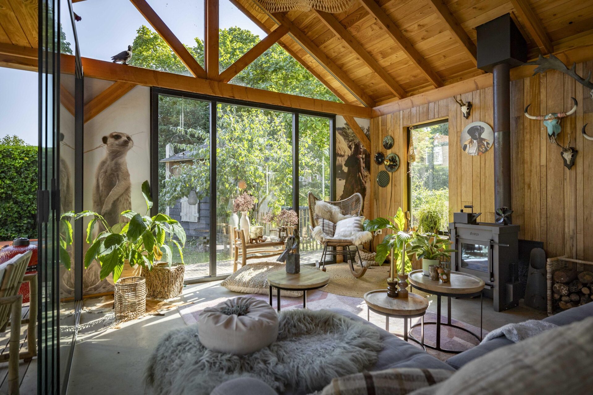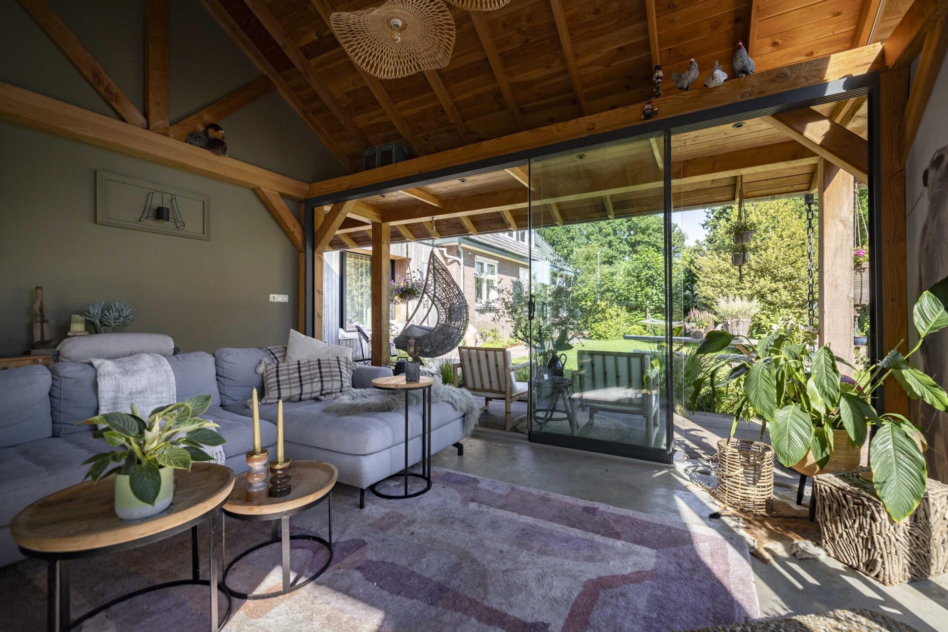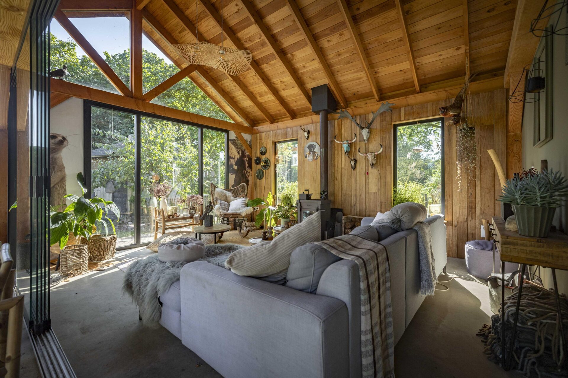 De tuin is verrassend ruim en gelegen aan de zijkant van de woning. Dankzij de ligging op het zuiden geniet je hier volop van de zon. Veel groen, een gazon en meerdere fijne plekken om te zitten maken dit een heerlijke buitenruimte. Achter in de tuin staat een grote houten schuur met tuinkamer: een sfeervolle plek met glazen wanden waar je het hele jaar door kunt genieten van je eigen groene omgeving. Met aan de achterzijde uitzicht op de kippenren waar je elke ochtend verse eitjes kunt pakken. Parkeren is geen probleem: op eigen terrein is ruimte voor twee auto’s.