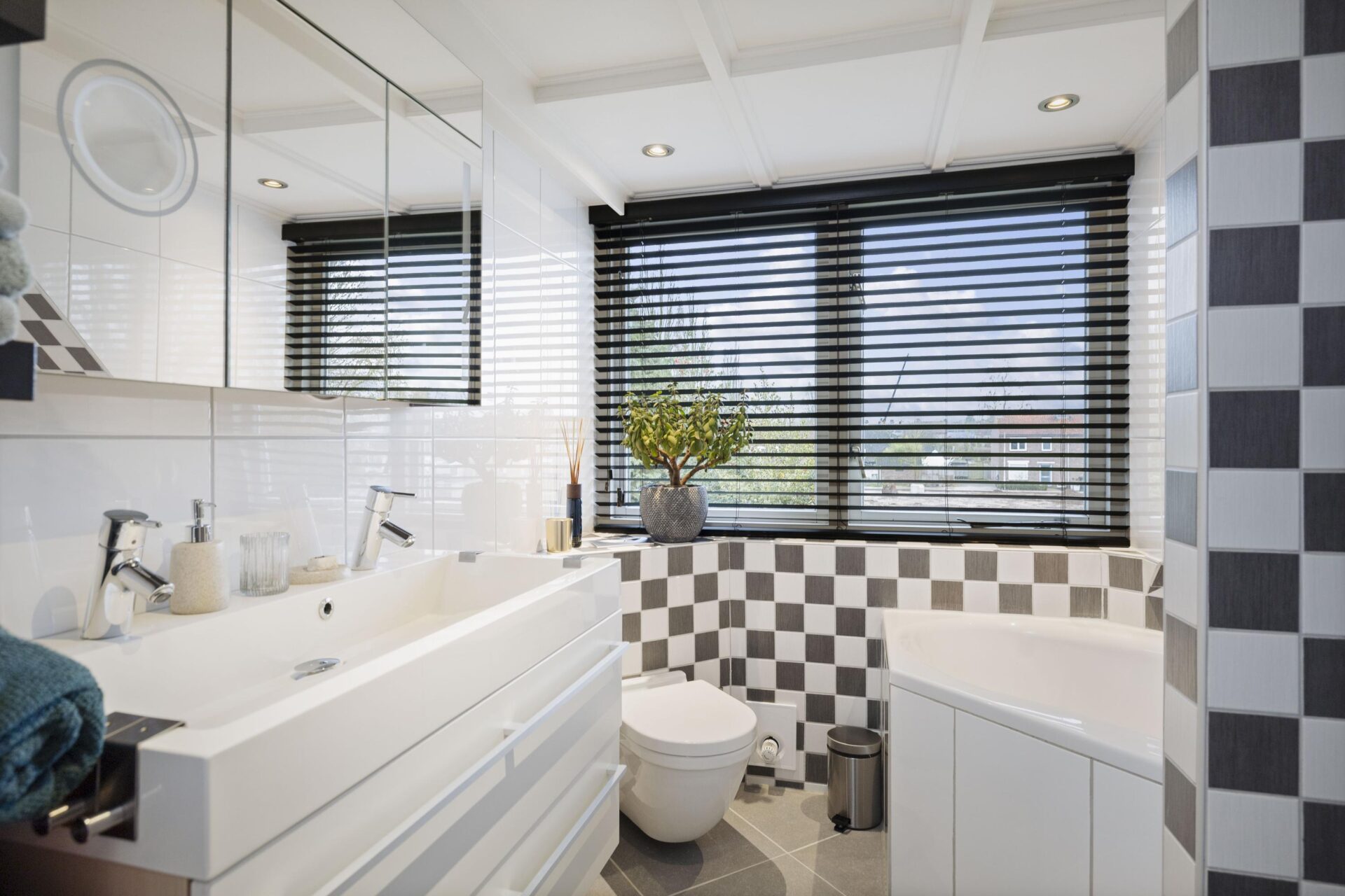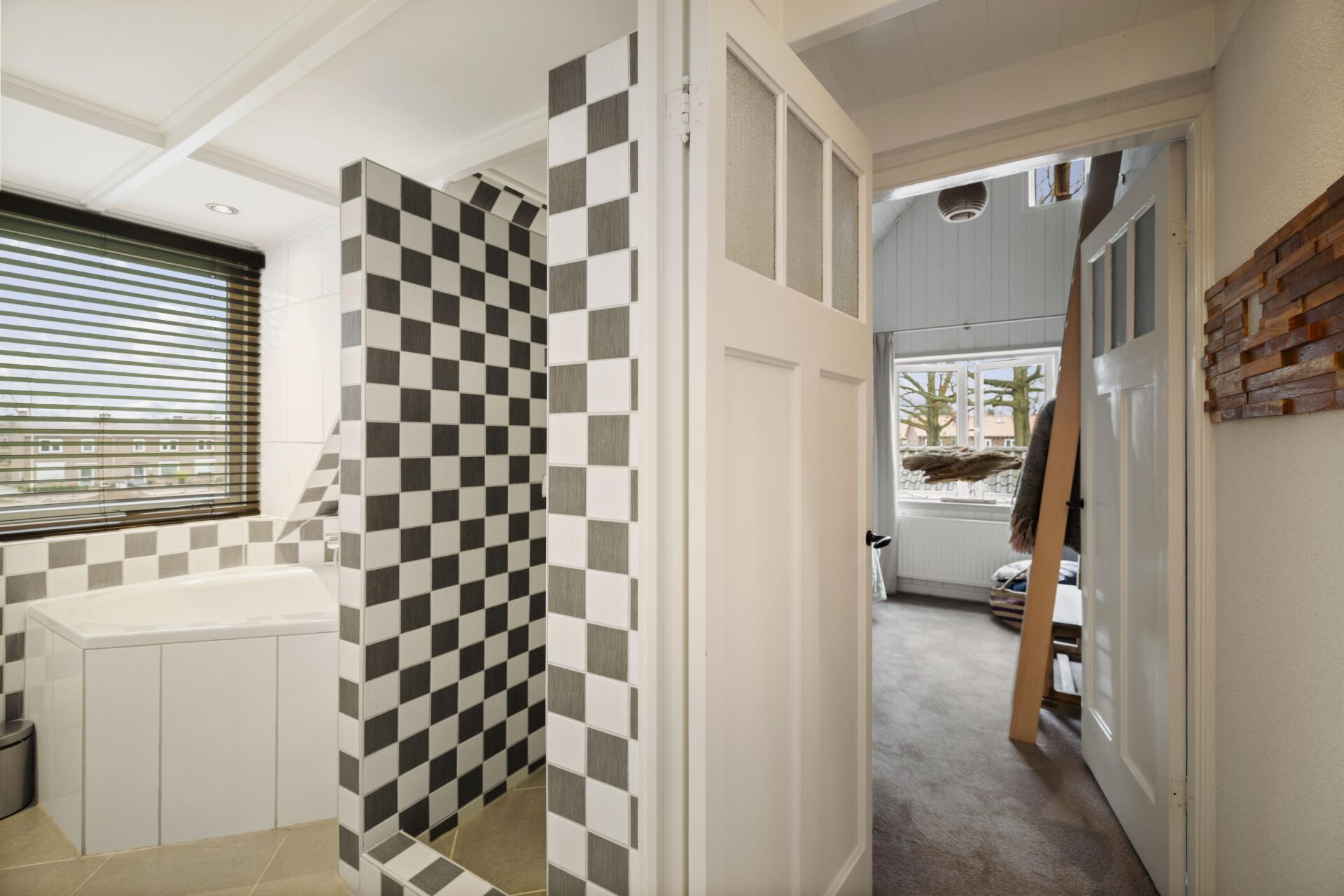 De vaste trap brengt je naar de verdieping met een royale overloop met dakkapel. Er zijn twee slaapkamers die beide van een goed formaat zijn. De badkamer is voorzien van een douche, ligbad, toilet en wastafelmeubel.
