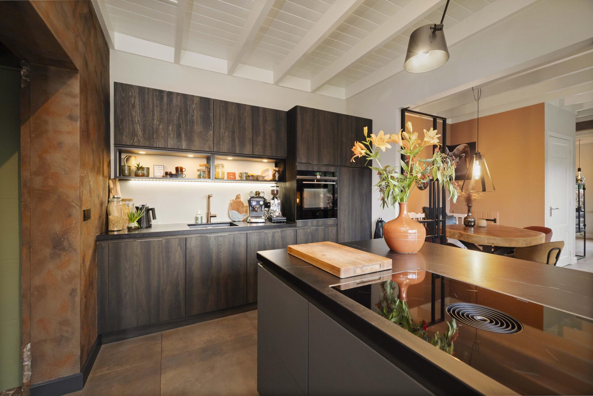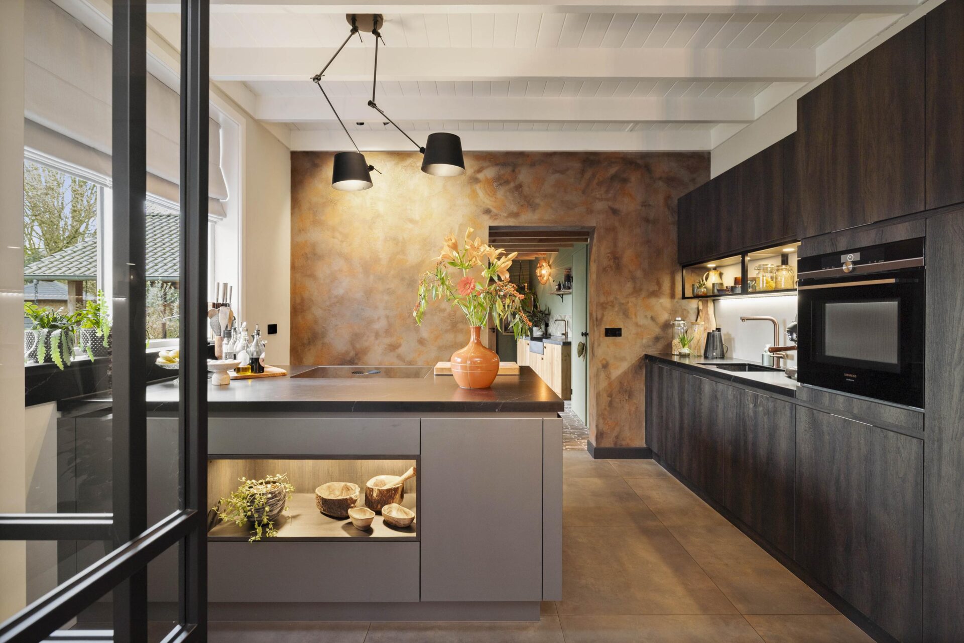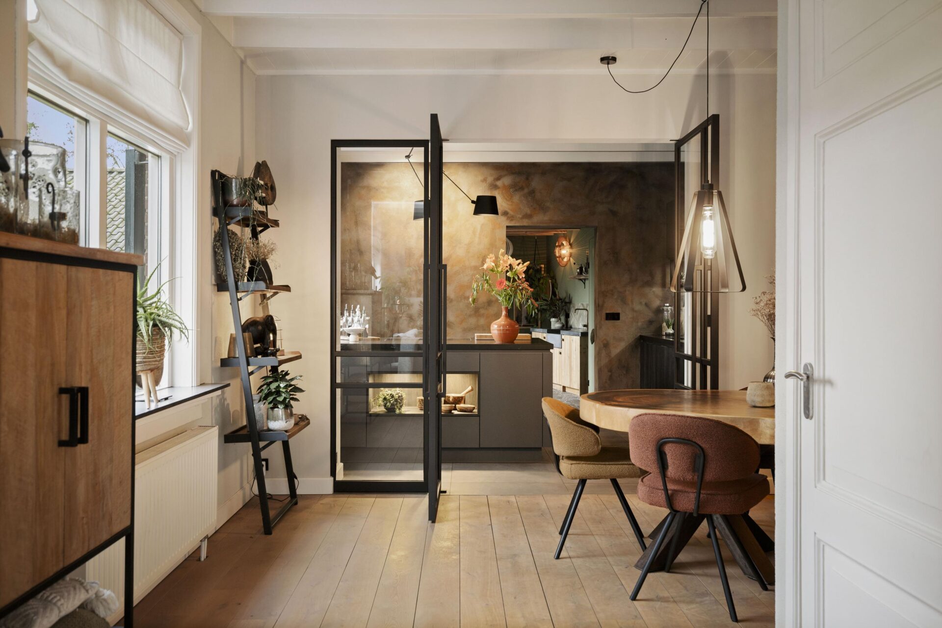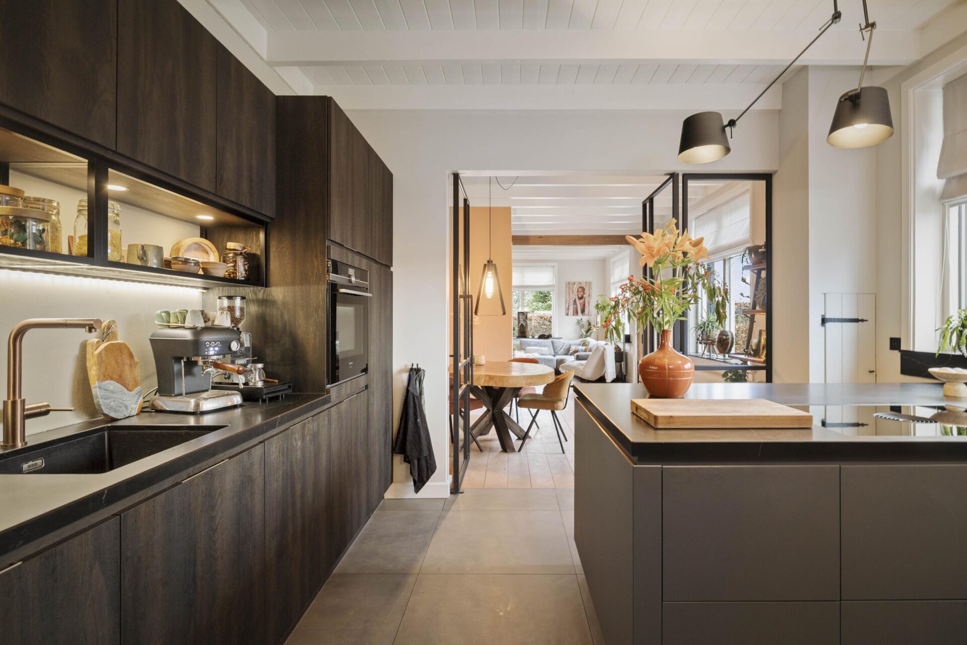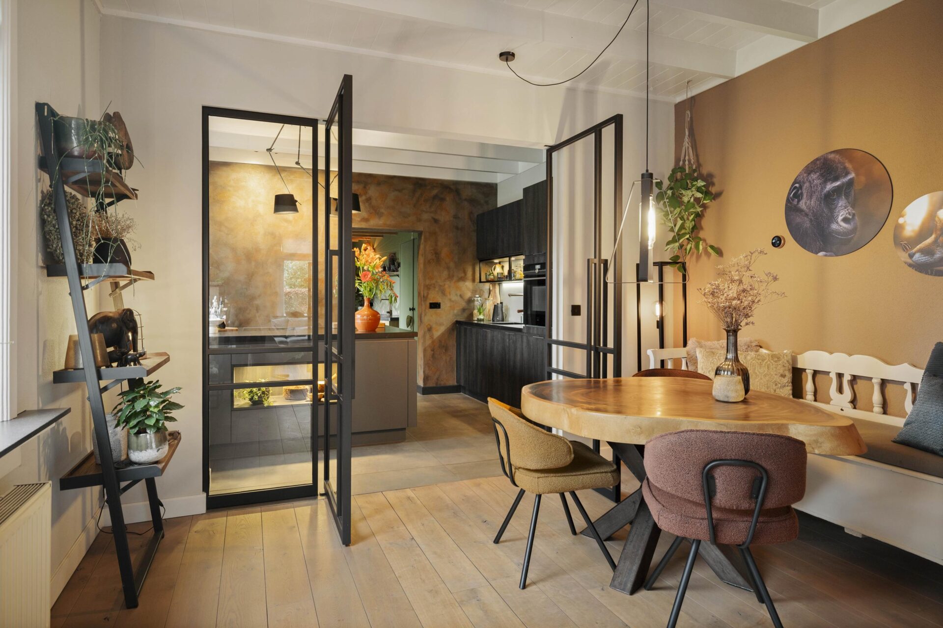 Via de achterdeur kom je de woning binnen in de bijkeuken. Een ideale ruimte met het toilet, een aanrechtblok en vaste kast als opbergruimte. Je loopt door naar de keuken, deze is uitgevoerd in moderne kleurstellingen en voorzien van alle hedendaagse gemakken. De openslaande glazen deuren geven je toegang tot de eetkamer en woonkamer, een ruimte die de karakteristieke sfeer laat zien. Via de woonkamer is de kelder bereikbaar.